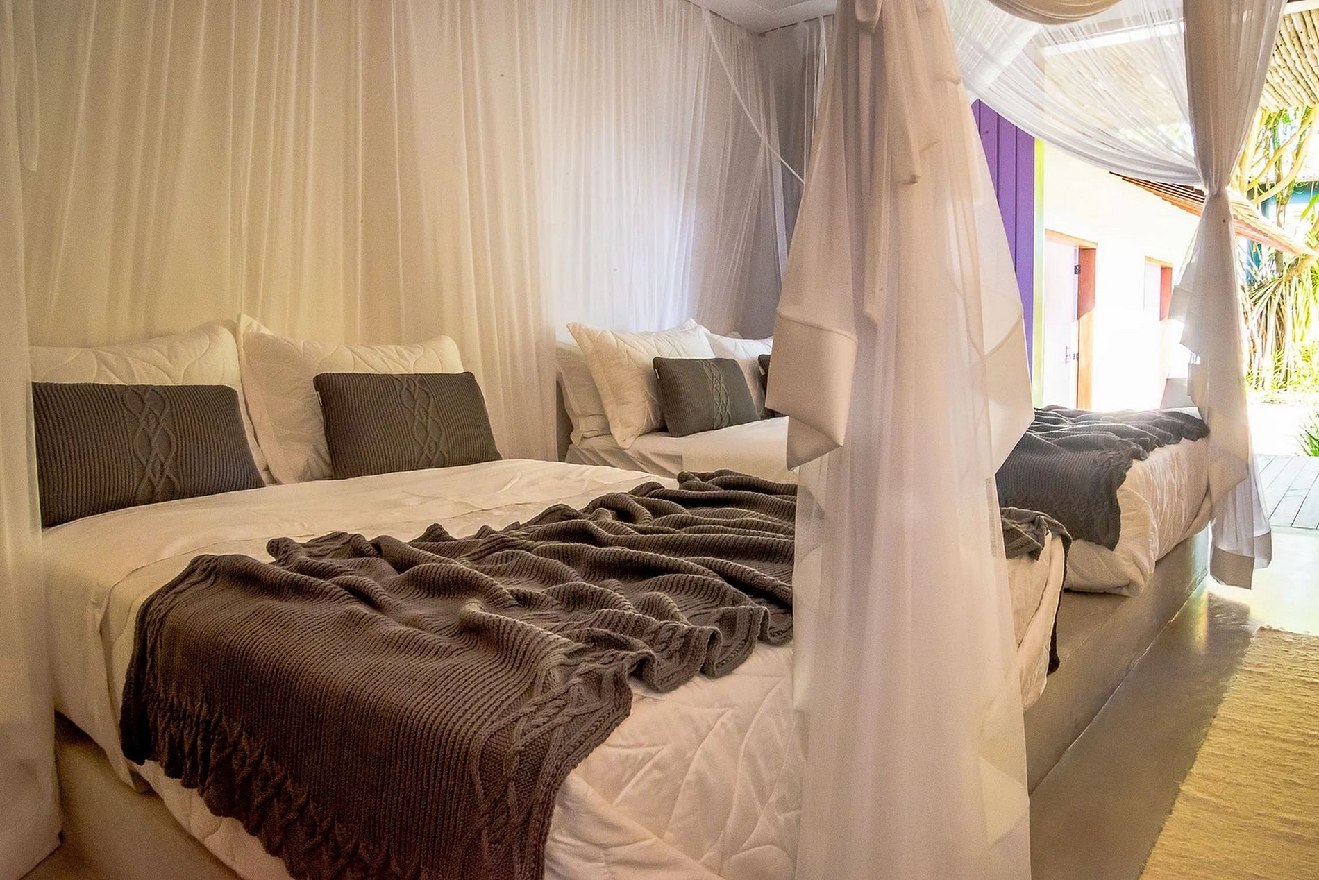 Six impeccably equipped suites, each adorned with king-size beds encased in mosquito nets for a peaceful sleep, promise a relaxing retreat. An additional suite offers two double beds that can be configured for single or double occupancy, also equipped with mosquito netting. Two more bedrooms, each with two single beds, share a bathroom and a cozy anteroom with TV and sofa bed.