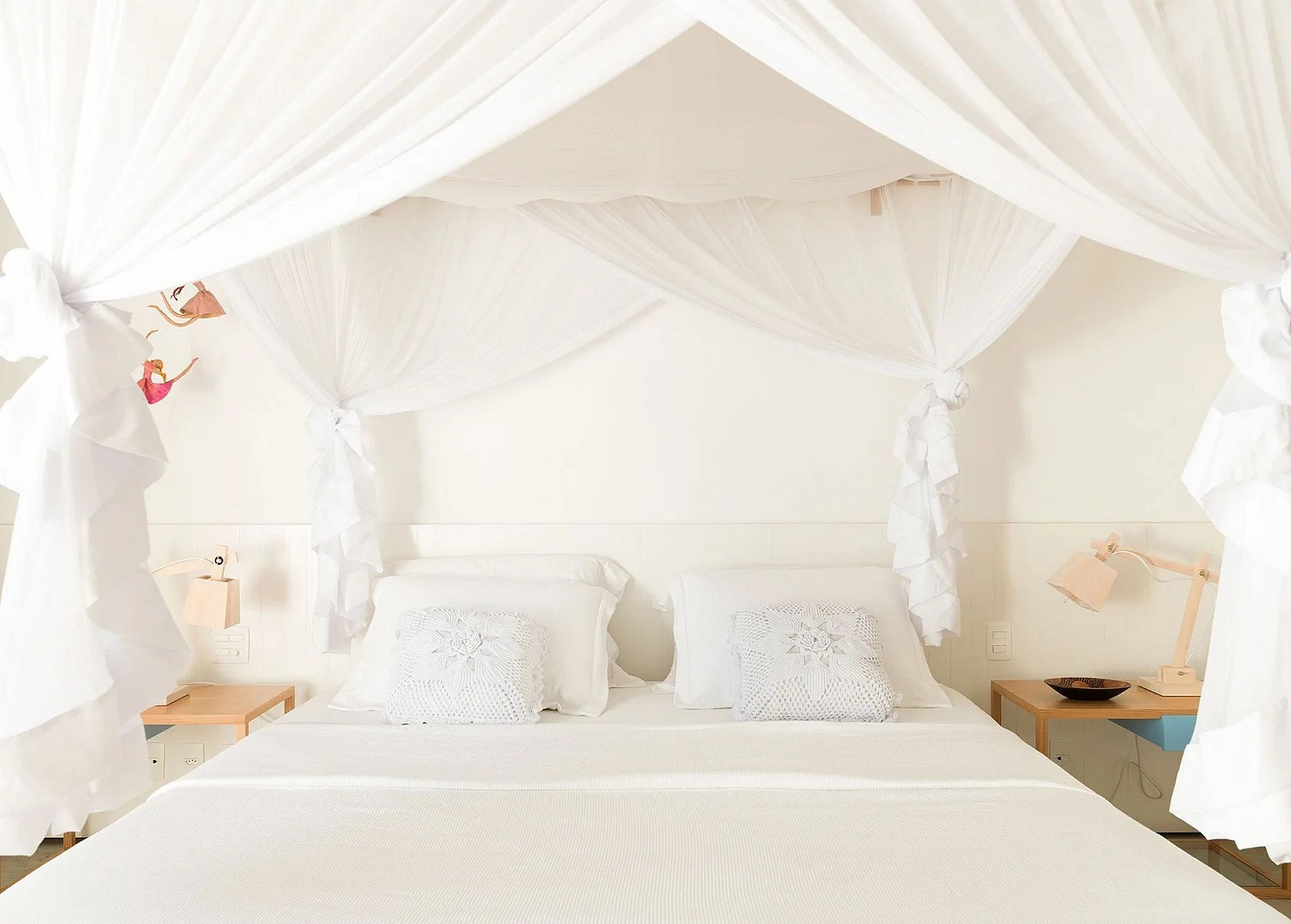On the first floor, you'll find the master suite, which comes with a king-size bed, central air conditioning, mosquito net, a large TV, double sink, double shower, and a minibar. There is another suite with two single beds on the first floor. On the ground floor, there is another suite with two single beds and four more suites with king-size beds. All suites are, of course, fully equipped with air conditioning and mosquito nets.