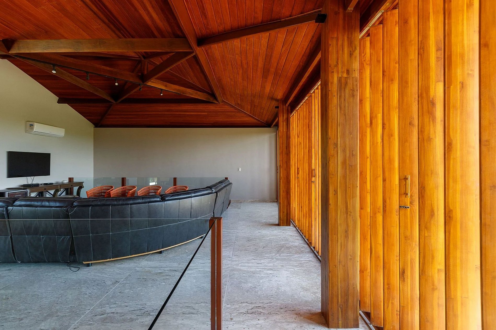 Designed with an open concept to harness the sunlight, the lower level hosts a spacious area comprising 2 lounges with intelligent TV setups, 2 dining spaces, and a kitchen. The entire ambiance boasts centralized air conditioning and provides a glimpse of the outdoor surroundings.