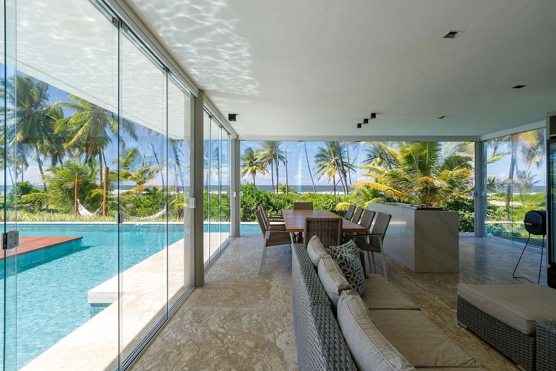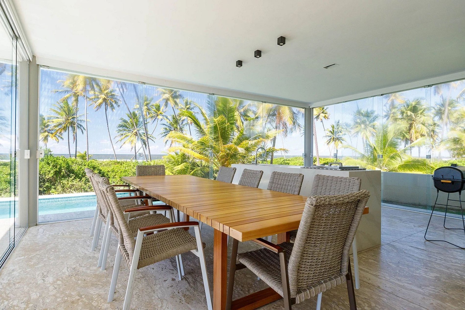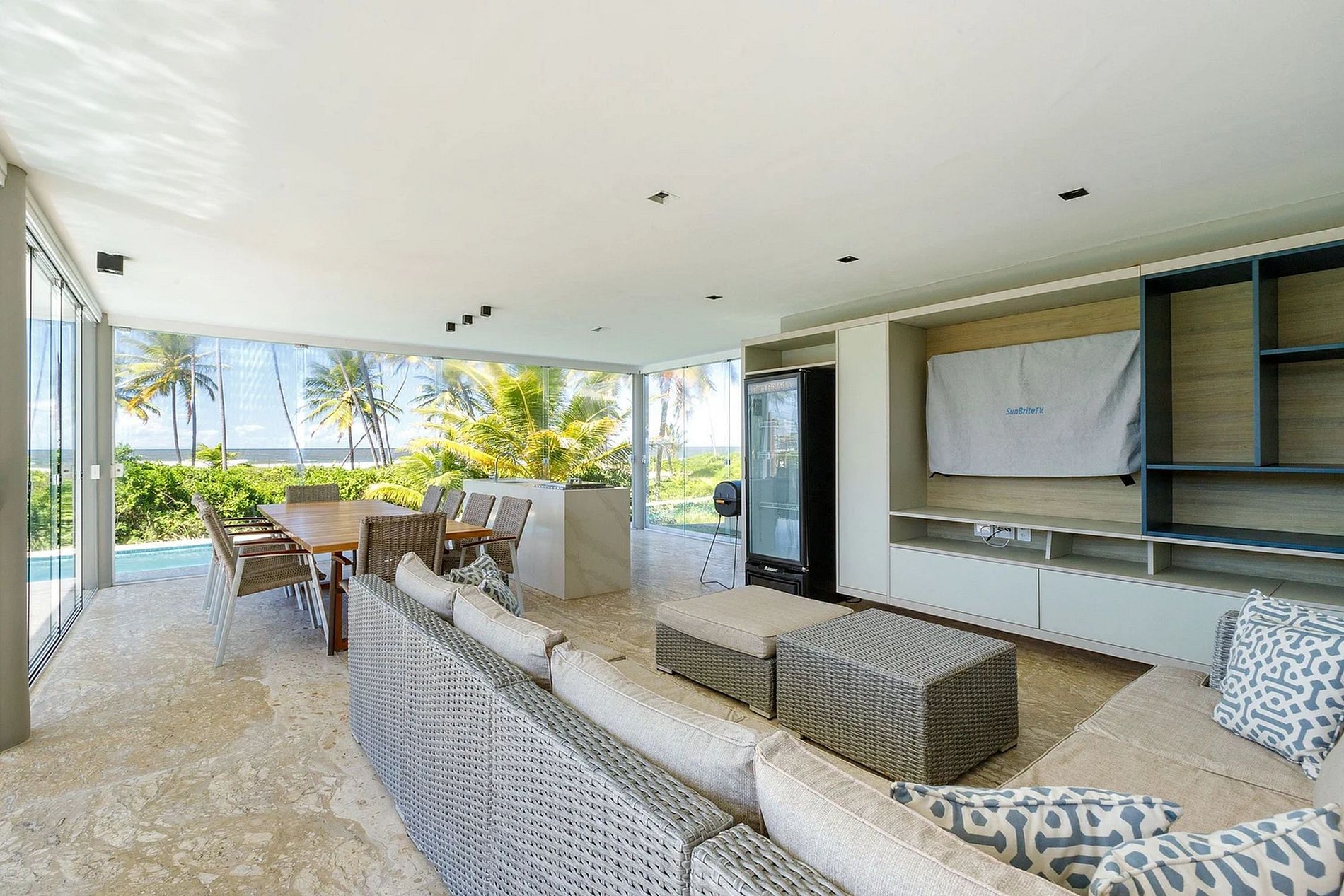 The dual lounges feature 2 expansive sofas each, an ideal setting for socializing with companions while indulging in movies and series on the sizable smart TV, all within reach of the expansive swimming pool. Both spaces also feature a dining table accommodating 10 individuals.