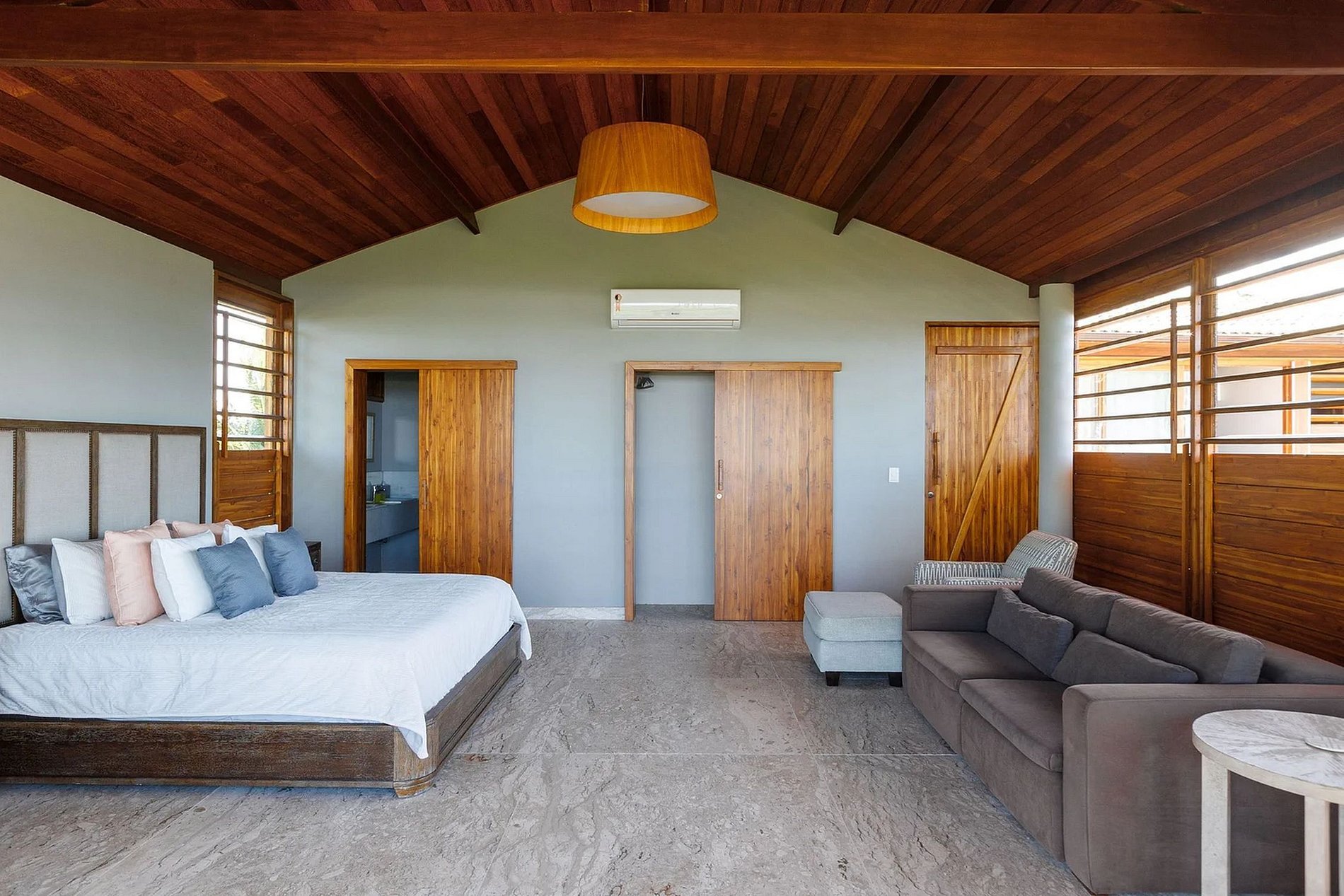 The first suite, situated on the ground floor, offers generous air-conditioned space with a king-size bed, a sofa bed for children, and an exclusive bathroom.