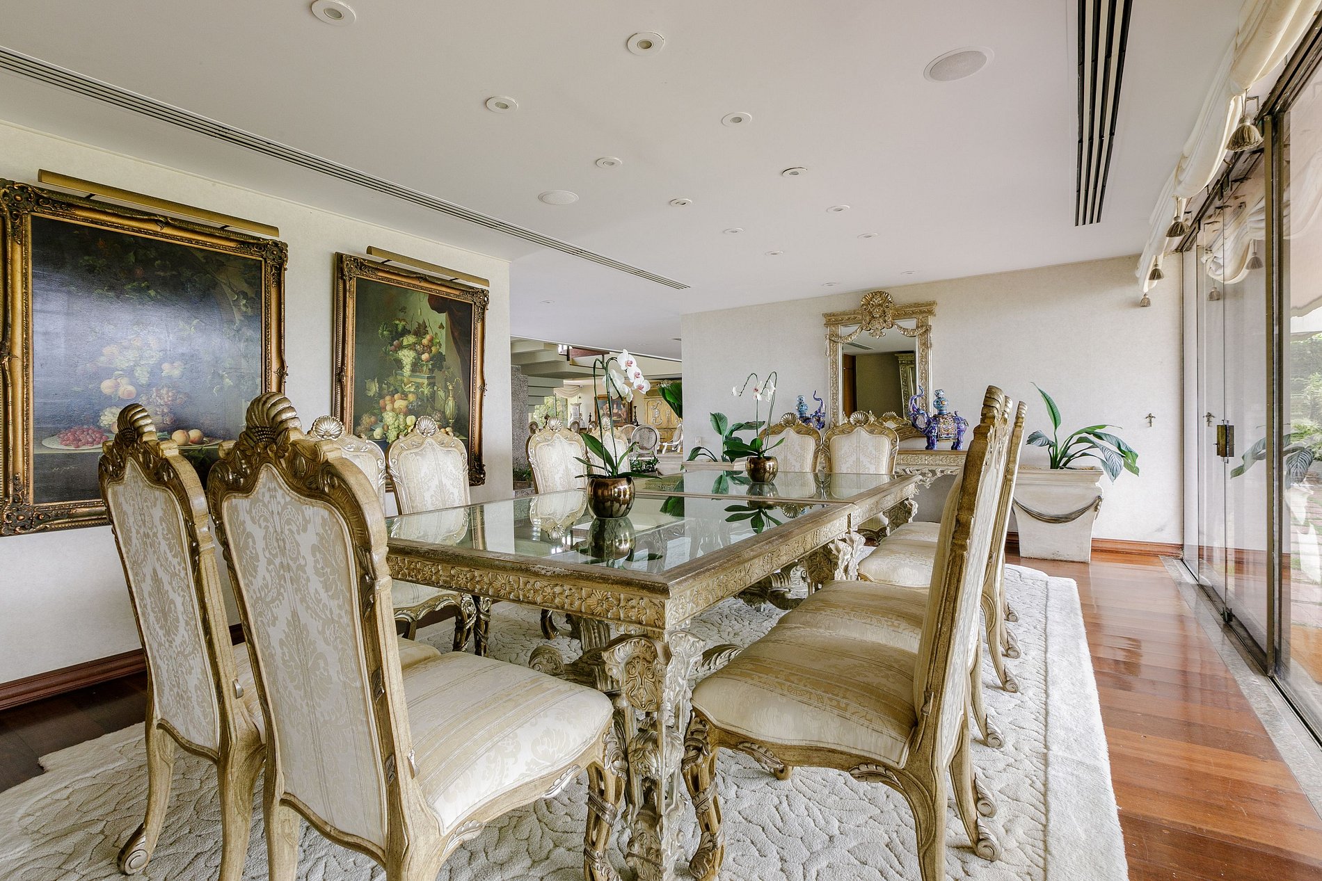 Upon entering this splendid residence, you are greeted by a spacious living room thoughtfully divided into several distinct areas, including an elegant bar, a refined dining room, an expansive terrace, a sophisticated powder room, and a fully equipped pantry and kitchen.