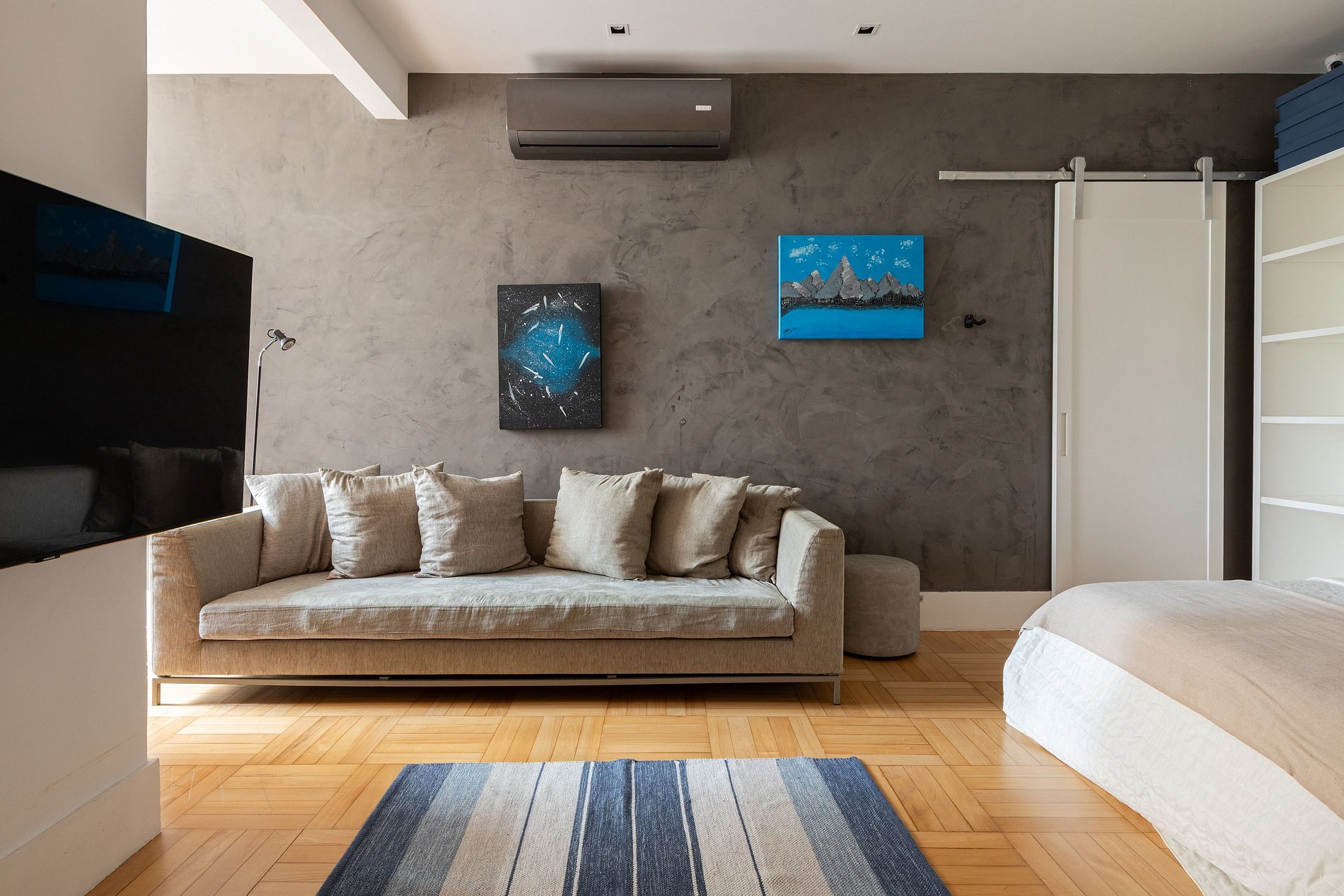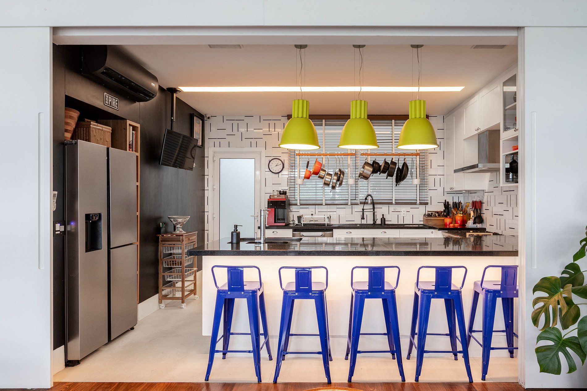 The living room is expansive, bright and fully air-conditioned, equipped with a projector and seamlessly connected to the kitchen through wide sliding doors, creating a fluid and functional environment.