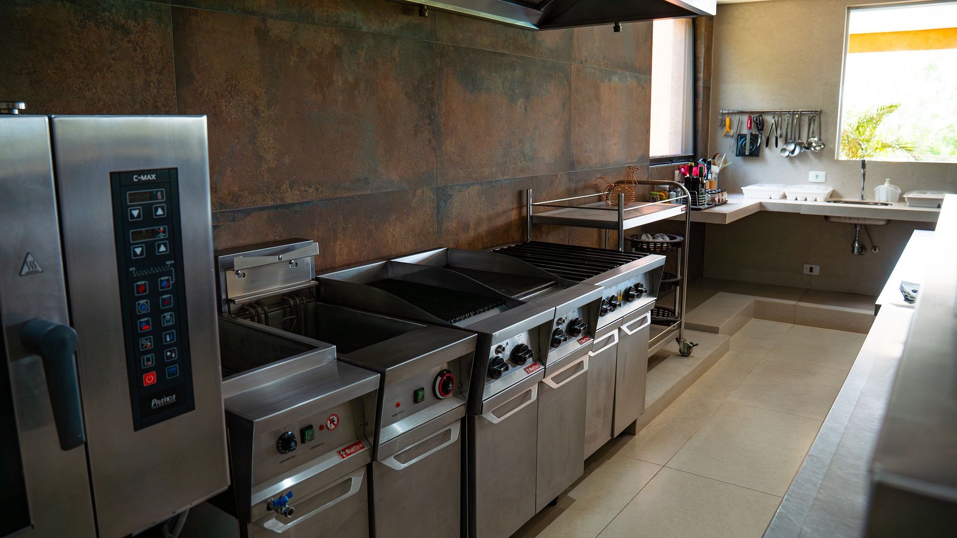 The professional kitchen is designed to support high-level service and includes an on-site chef, enabling customized menus tailored to each group. Here, gastronomy becomes an integral part of the stay rather than a supporting service.