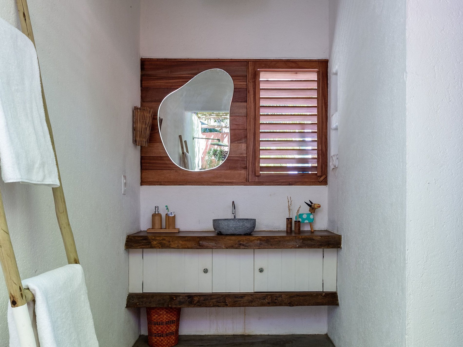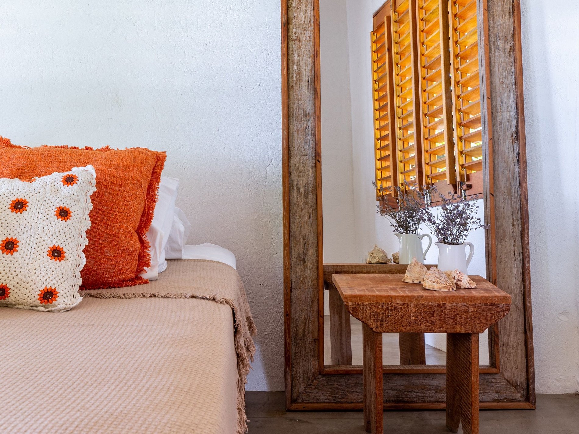 The accommodation is divided between the main house (5 bedrooms) and a charming bungalow (2 bedrooms), totaling 7 suites with direct access to the garden. There are 6 bedrooms with double beds and 1 bedroom with two bunk beds — perfect for children. The interior, designed by an internationally renowned designer, values ​​art, furniture and local crafts, combining sophistication and authenticity in every detail.