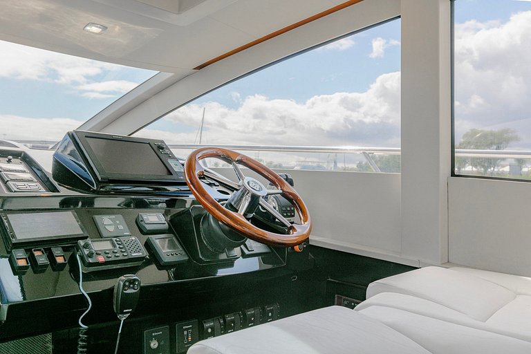 With two volvo 950 ips engines, three bedrooms, one of which is a suite, a single cabin that can also be converted into a double, and a bow cabin with a social bathroom, a full kitchen with two refrigerators 2, a mini freezer, a microwave electric stove, spacious living room with two sofas, closets in the bedrooms and in the living room, hot water in all taps, generator of 15, ice machine, Bluetooth sound, with independent automation in all environments, barbecue.