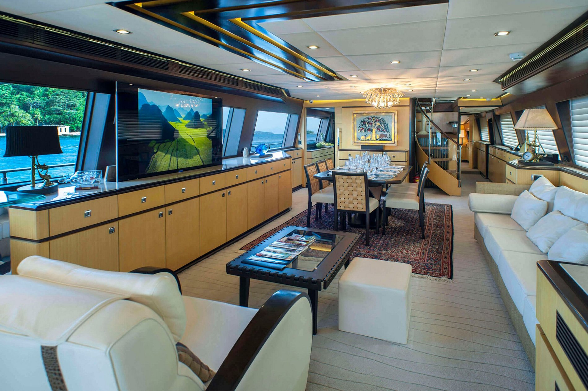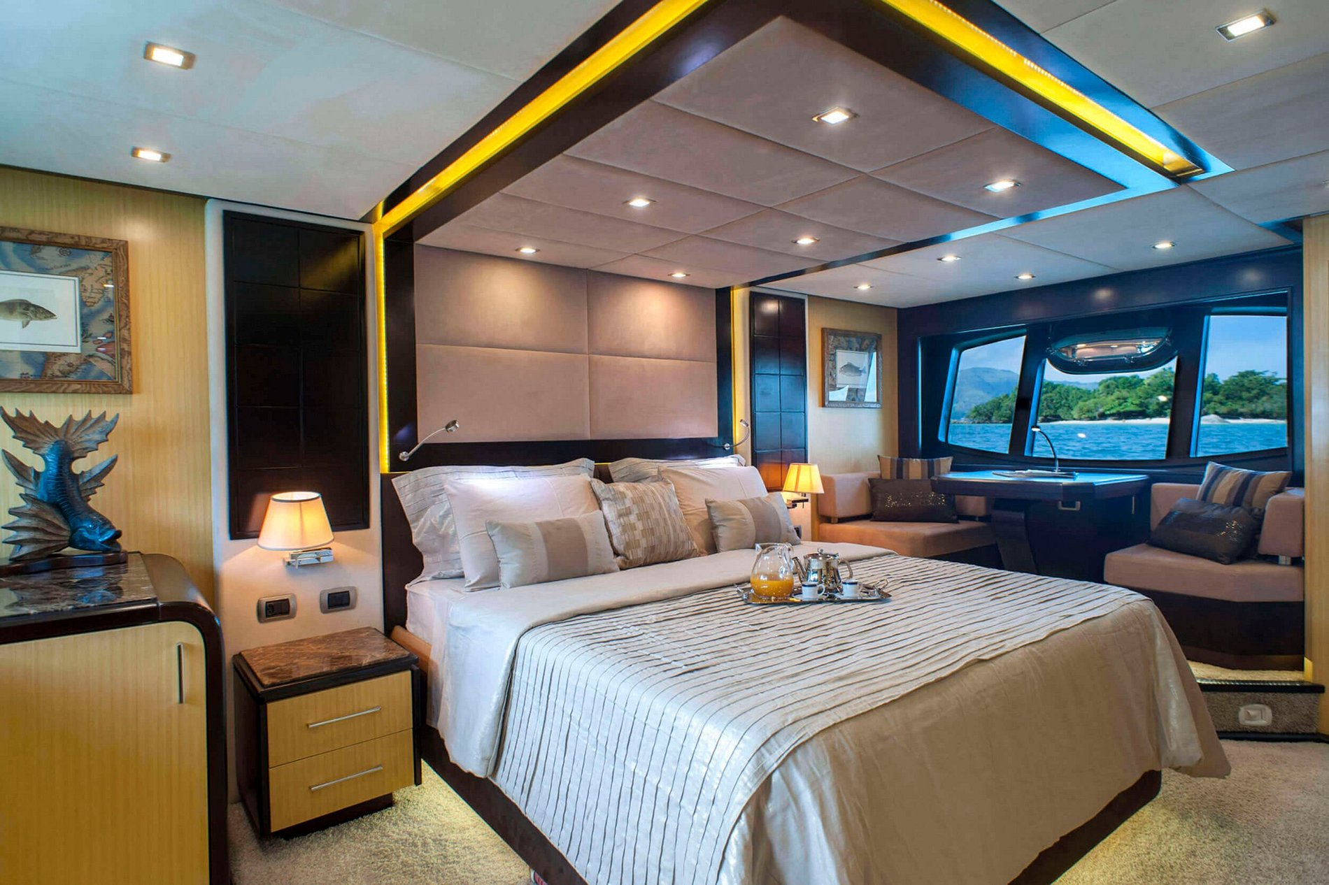 The internal part consists of a TV room, kitchen, cabins, living room and dining room. the yacht accommodates 10 people in 4 suites. Each of her cabins has the same amenities you would expect from a beautiful yacht like this.