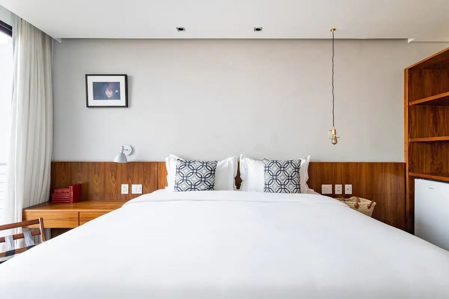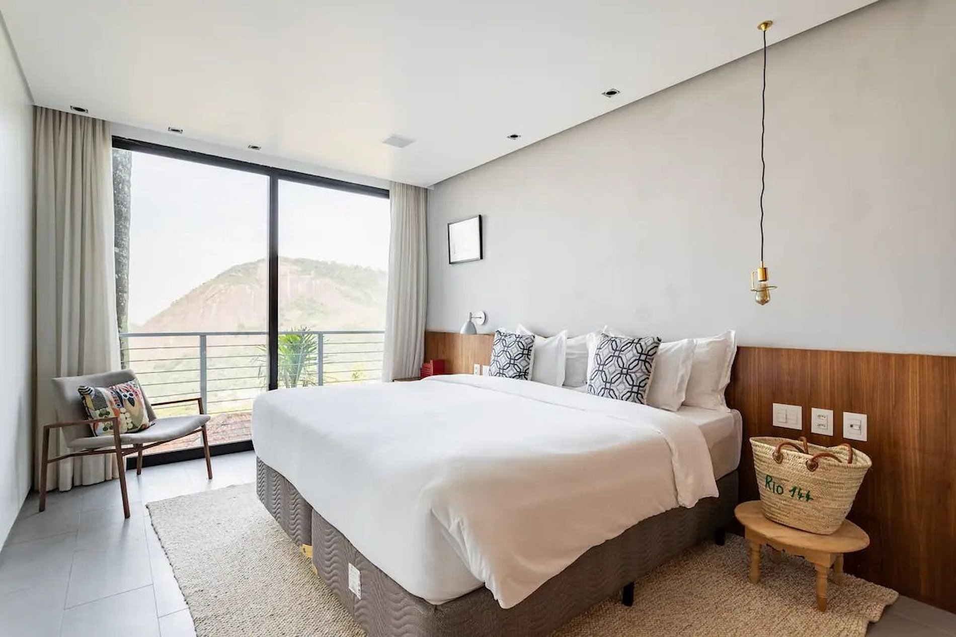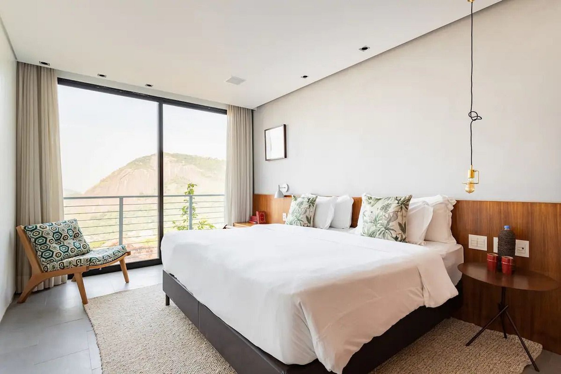 The Deluxe Suite has 40m2, living room, desk, high-end soft bedding, large wardrobe, Bluetooth music, fridge, safe, rain shower and bathtub, Nespresso coffee machine and splendid views of the mountains, the sea and also the Sugarloaf Mountain.