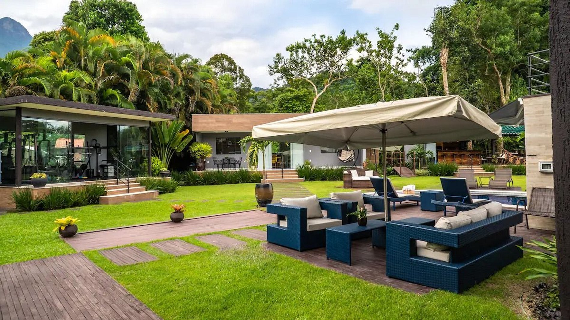 A fully air-conditioned house, which has a swimming pool, sauna, and gym. Outside, you can still enjoy the gourmet area with a barbecue, kitchen, gazebo, two covered dining tables, soccer field, and a suspended path that leads to a stream and a wooden house that is the enchantment of little guests.