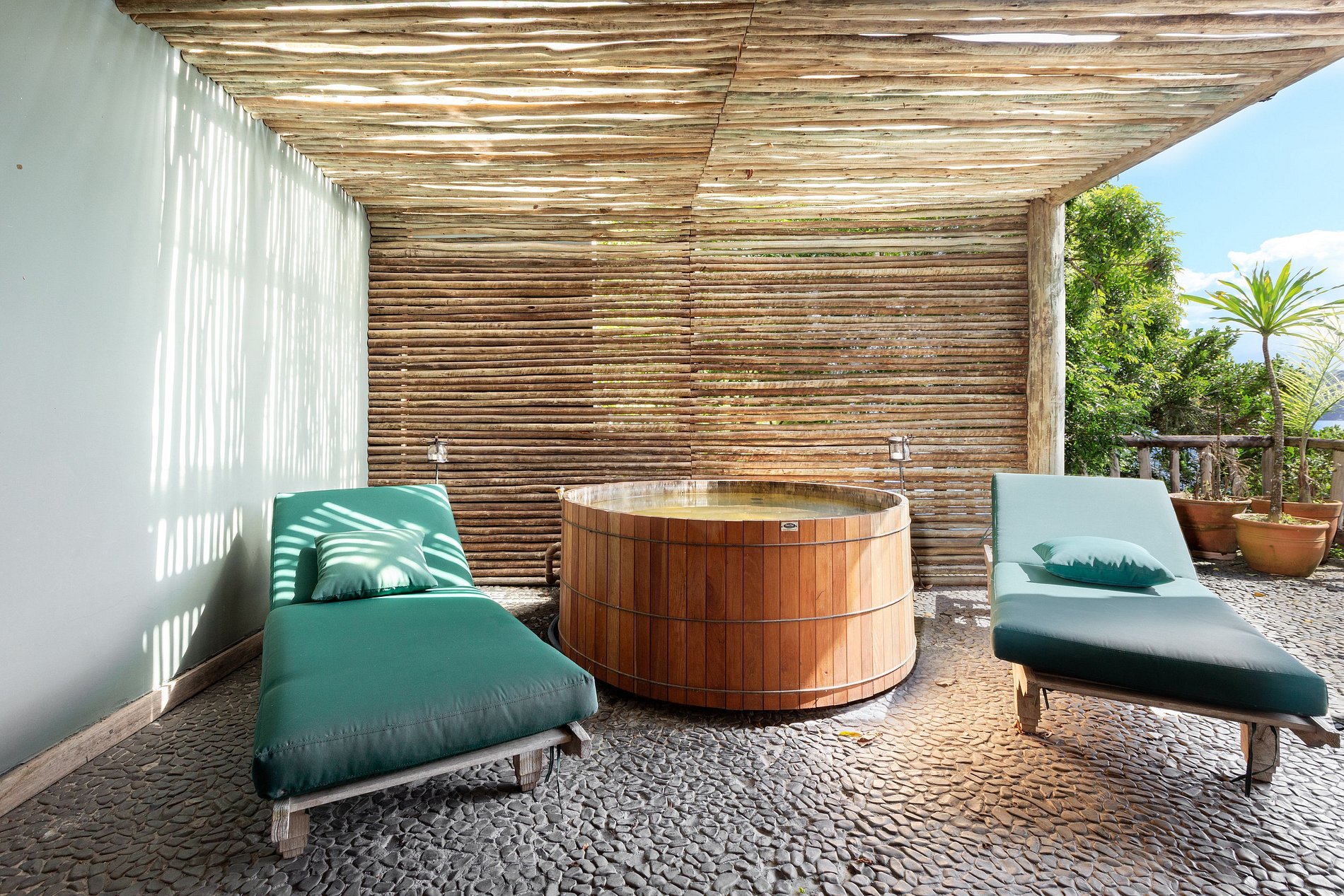 In addition to a delightful swimming pool, gourmet area with barbecue and wood-fired pizza oven, the house also includes a second covered and heated 25-meter swimming pool, two saunas, one dry and one steam, a modern fully equipped gym and jacuzzi. Lying down and enjoying the fresh sea breeze in the charming hammocks floating above the sea is just one more detail that makes the experience in this tropical corner unforgettable.