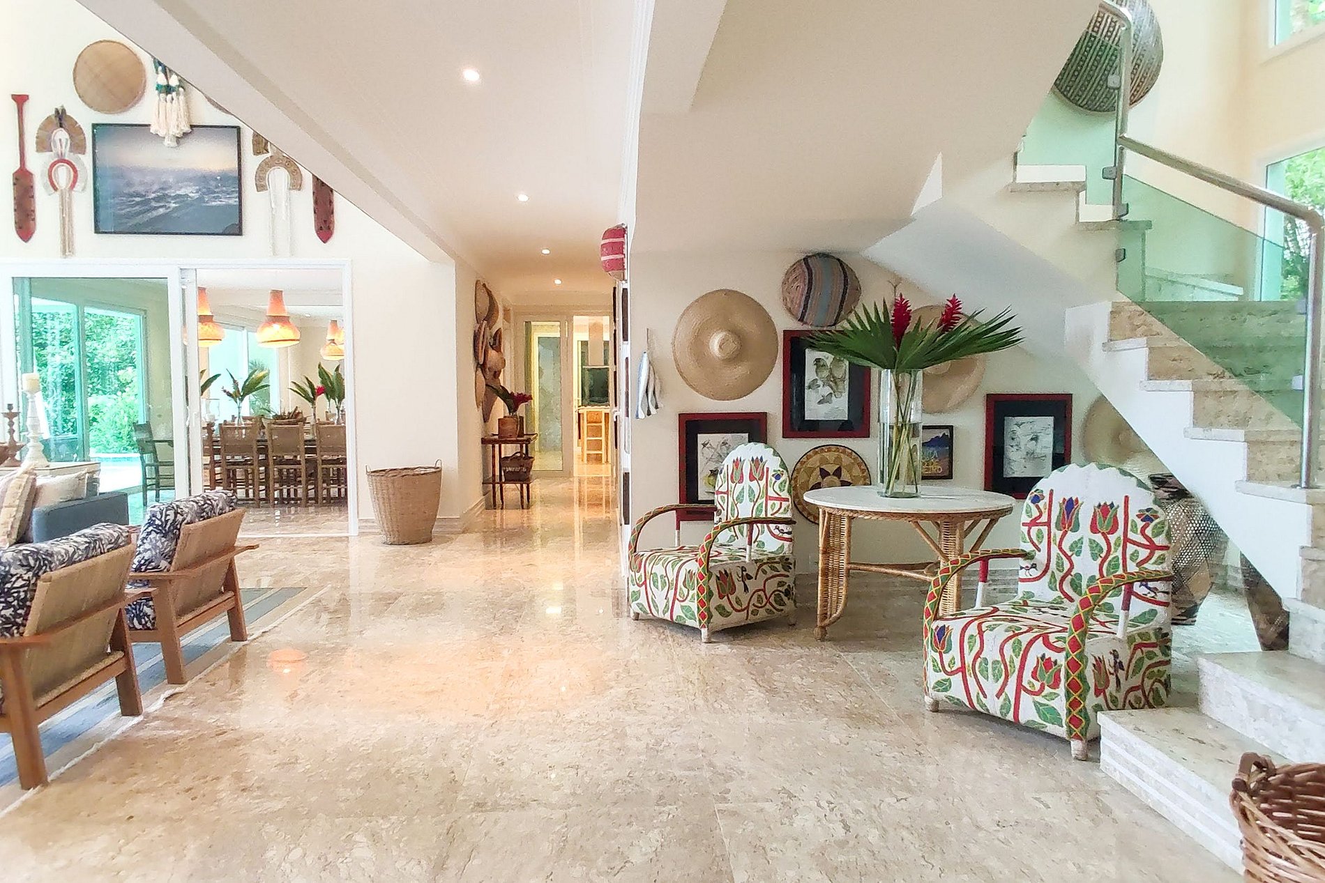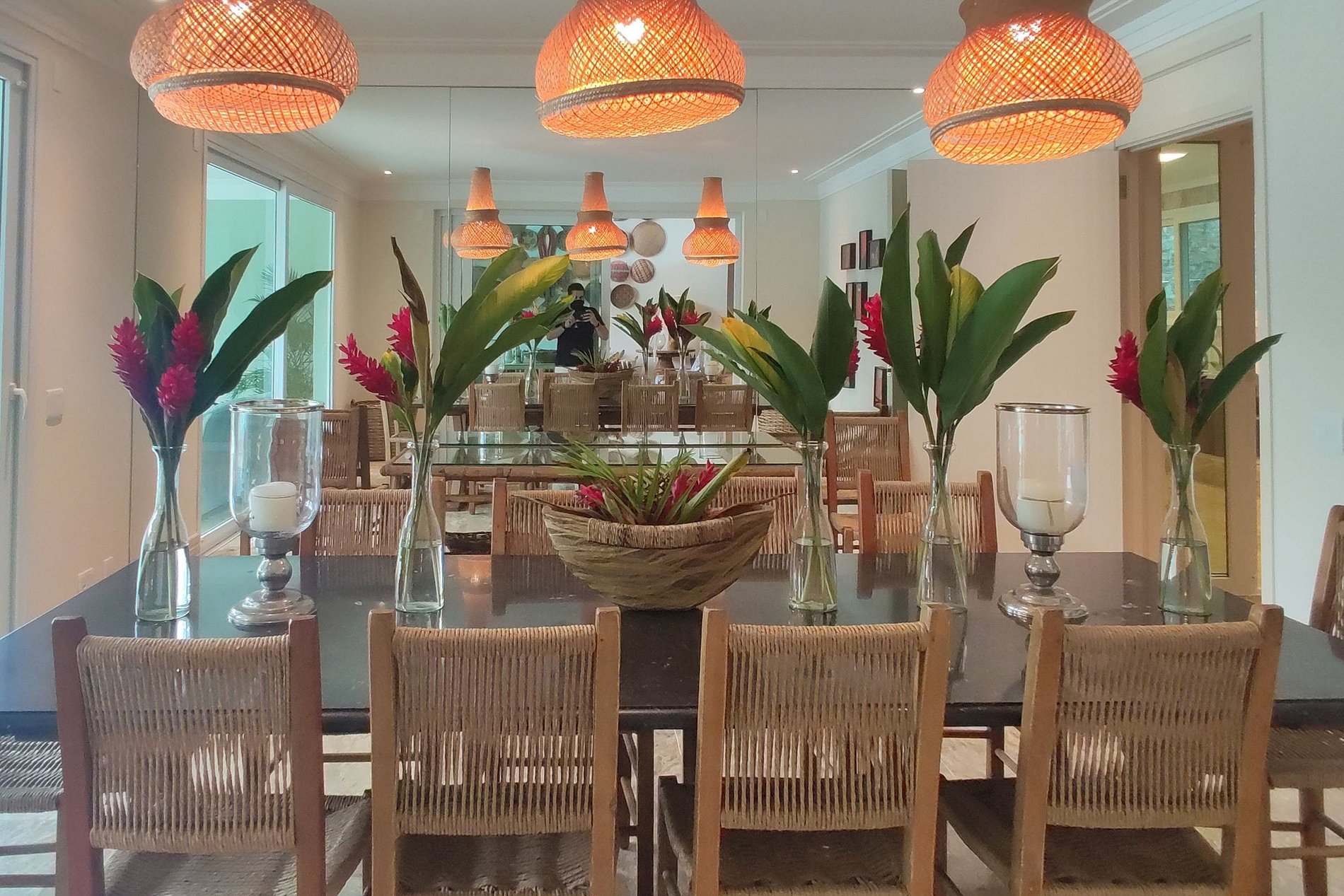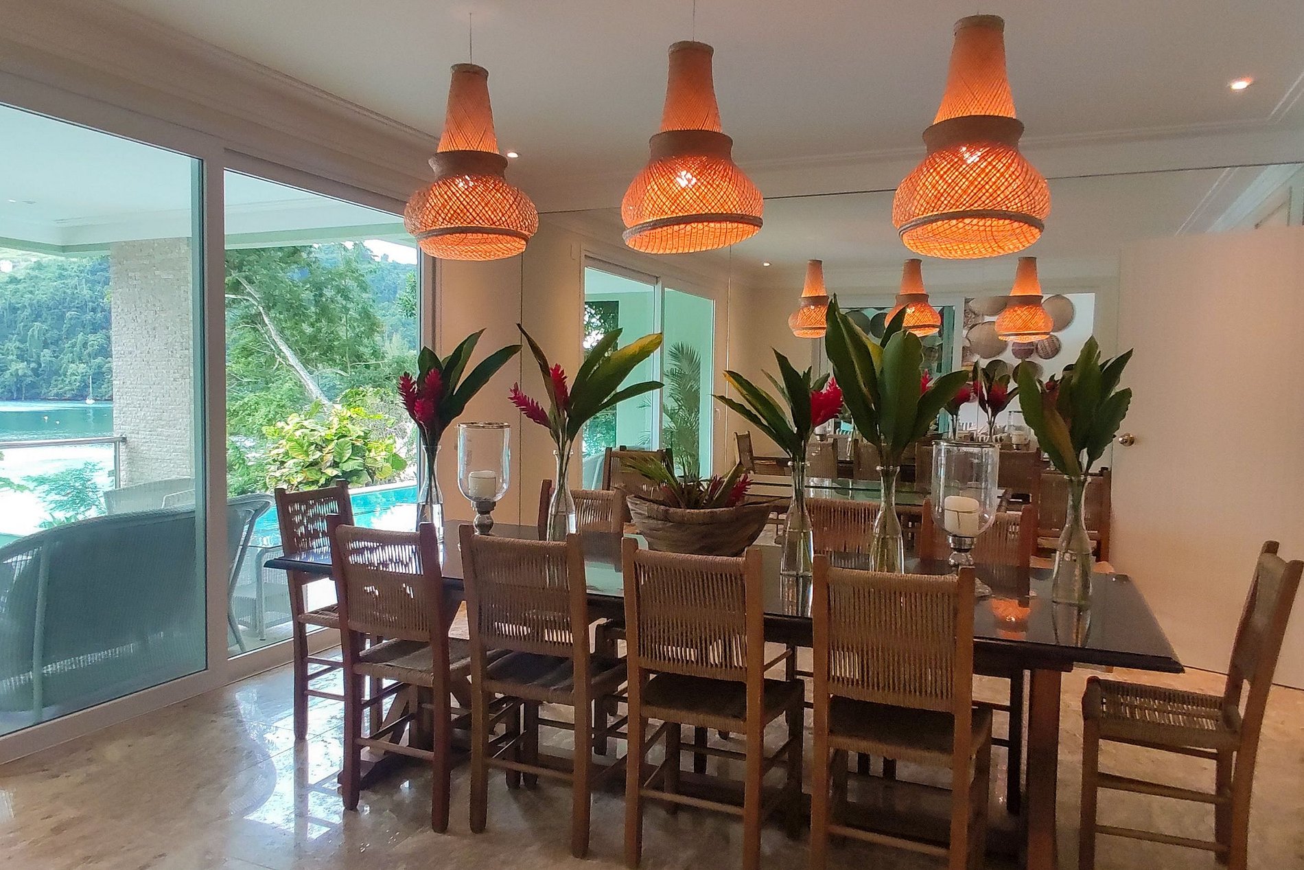 Within an area of 300 thousand square meters of preserved Atlantic Forest, in a high-end condominium with only three properties and a private beach with warm and crystalline waters, we find this exquisitely decorated house that combines high-end furniture and materials with the typical Brazilian handicraft.