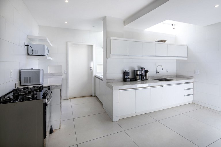 On the first floor, we have a spacious living and dining room, three bathrooms and a full kitchen. The second floor comprises six suites, with high-quality linens, all air-conditioned and with TV, three of which have a bathtub and the other three, with a private pool.