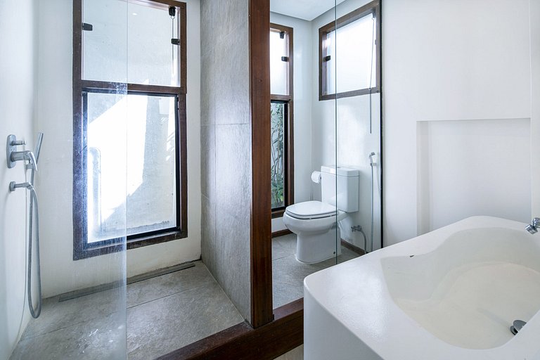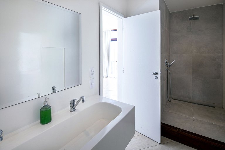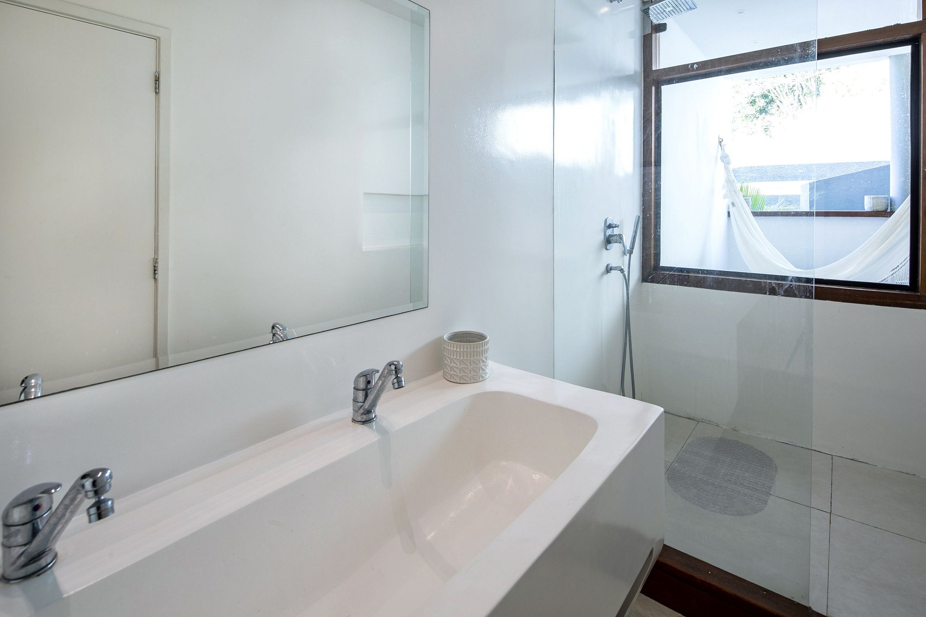 A villa divided into three floors, decorated in a simple and minimalist way, where the landscape is the star. Bright, spacious, bright and airy, within a gated community, with private security and a breathtaking view of both the forest and the Atlantic Ocean.