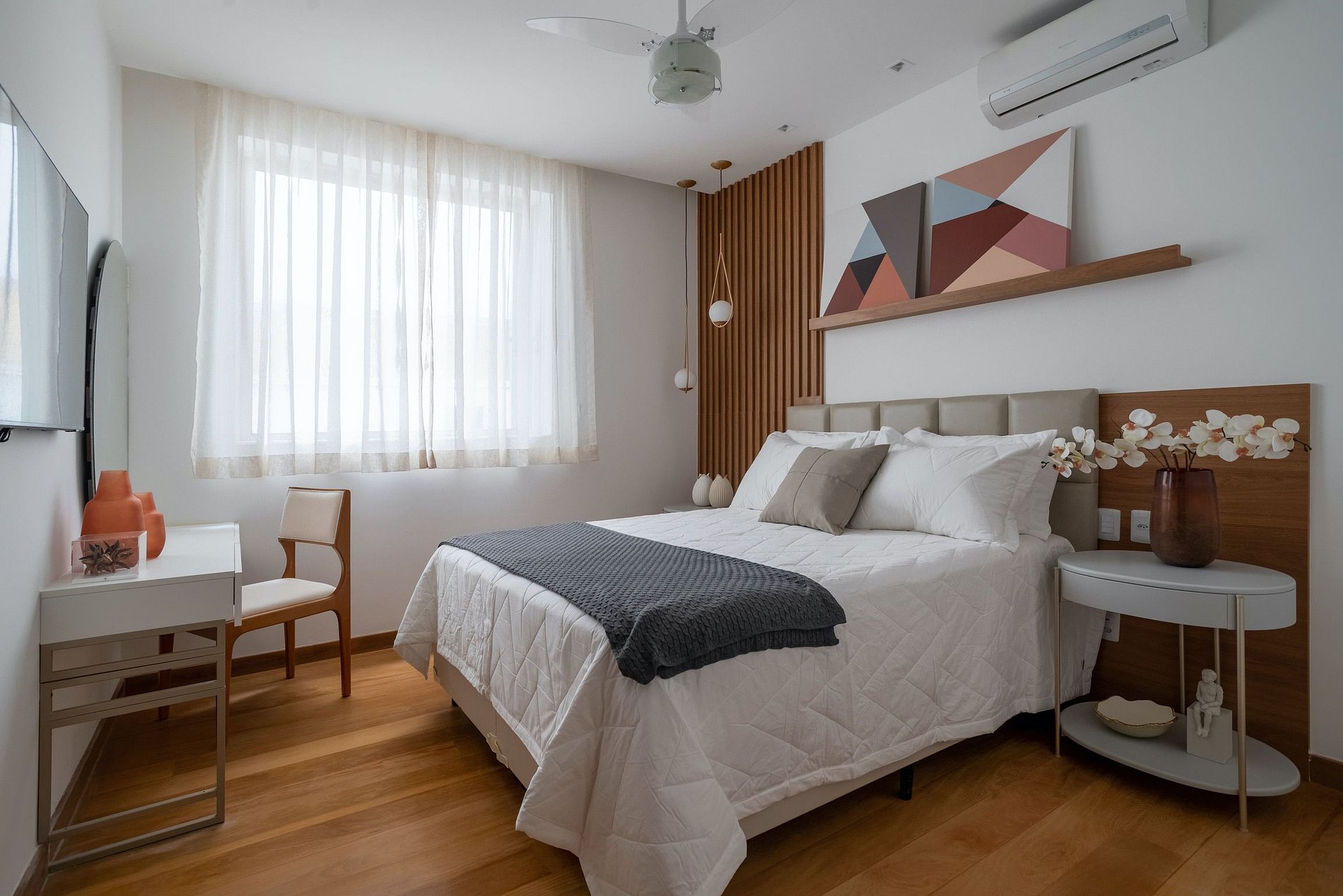 The second bedroom features a 60-inch TV, a beautifully appointed sofa against an artfully decorated backdrop, and a serene vertical garden area.