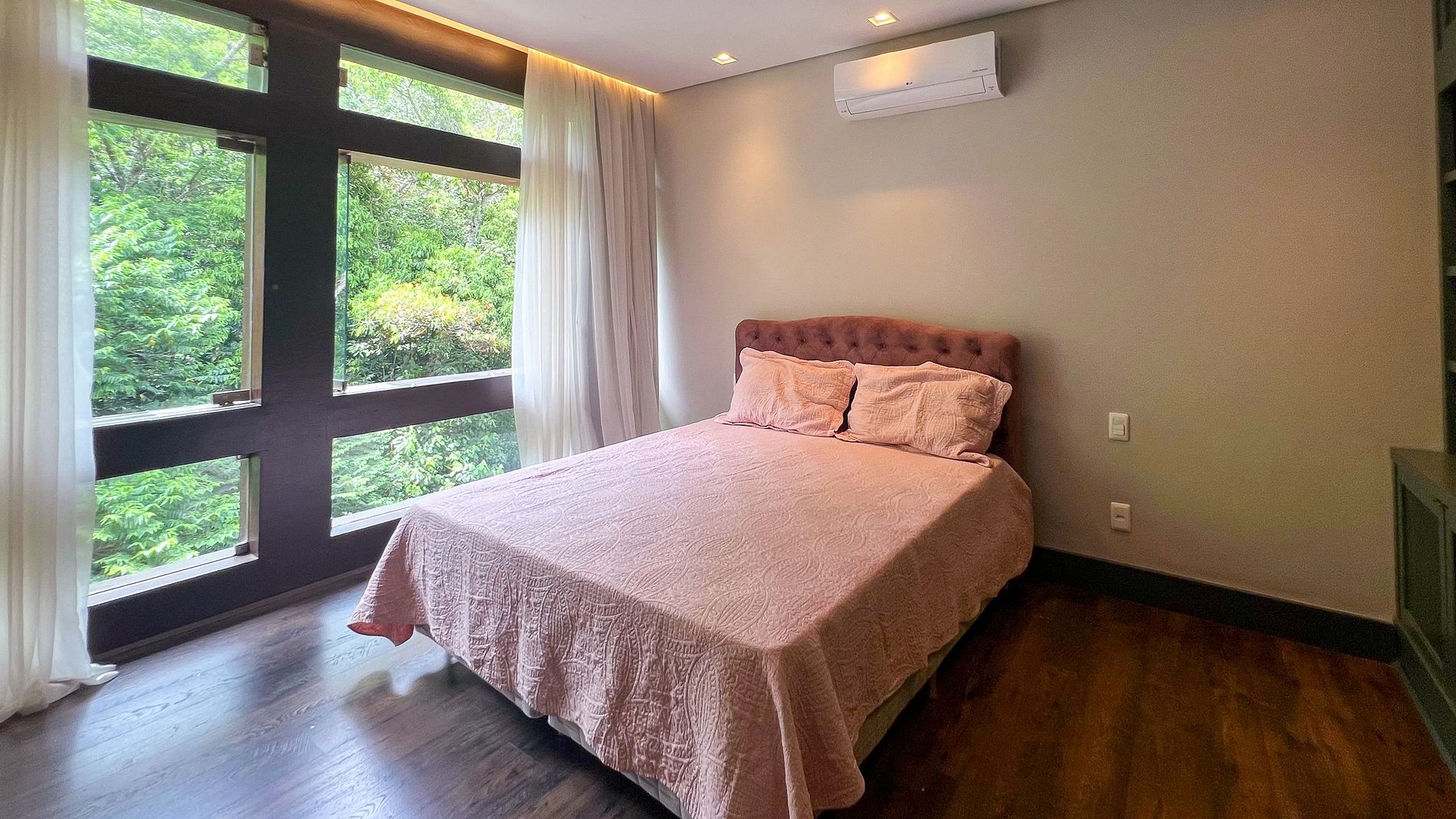 The master suite, equipped with a king-size bed, offers a stunning panoramic view of the nature and the city, as well as a spacious bathroom that includes a bathtub, double sink, and walk-in closet.