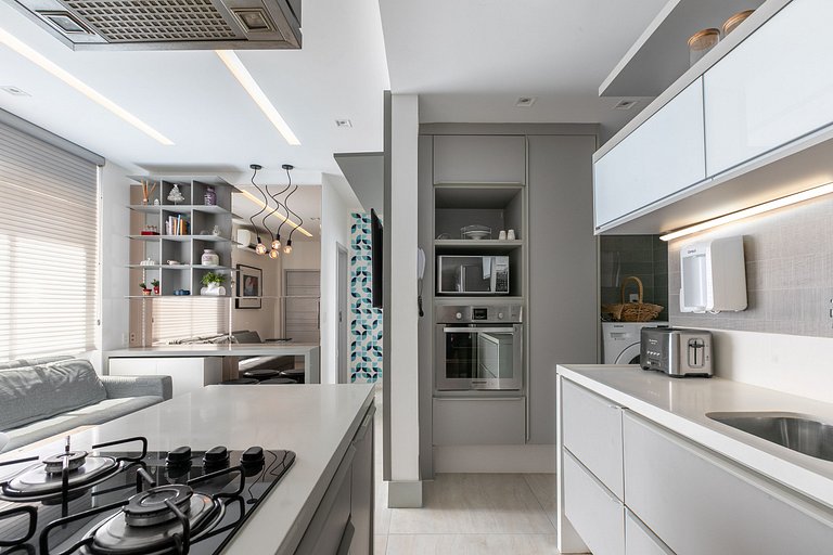 The place has a Nespresso machine, large TV in the living room, a sofa, a dining table, American kitchen with a cooktop. Everything you need for those looking for something smaller, but with a luxurious and comfortable style.