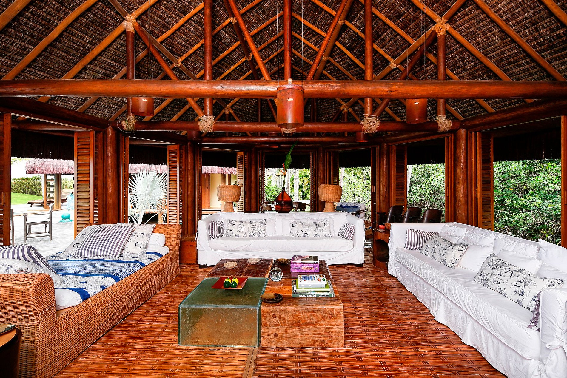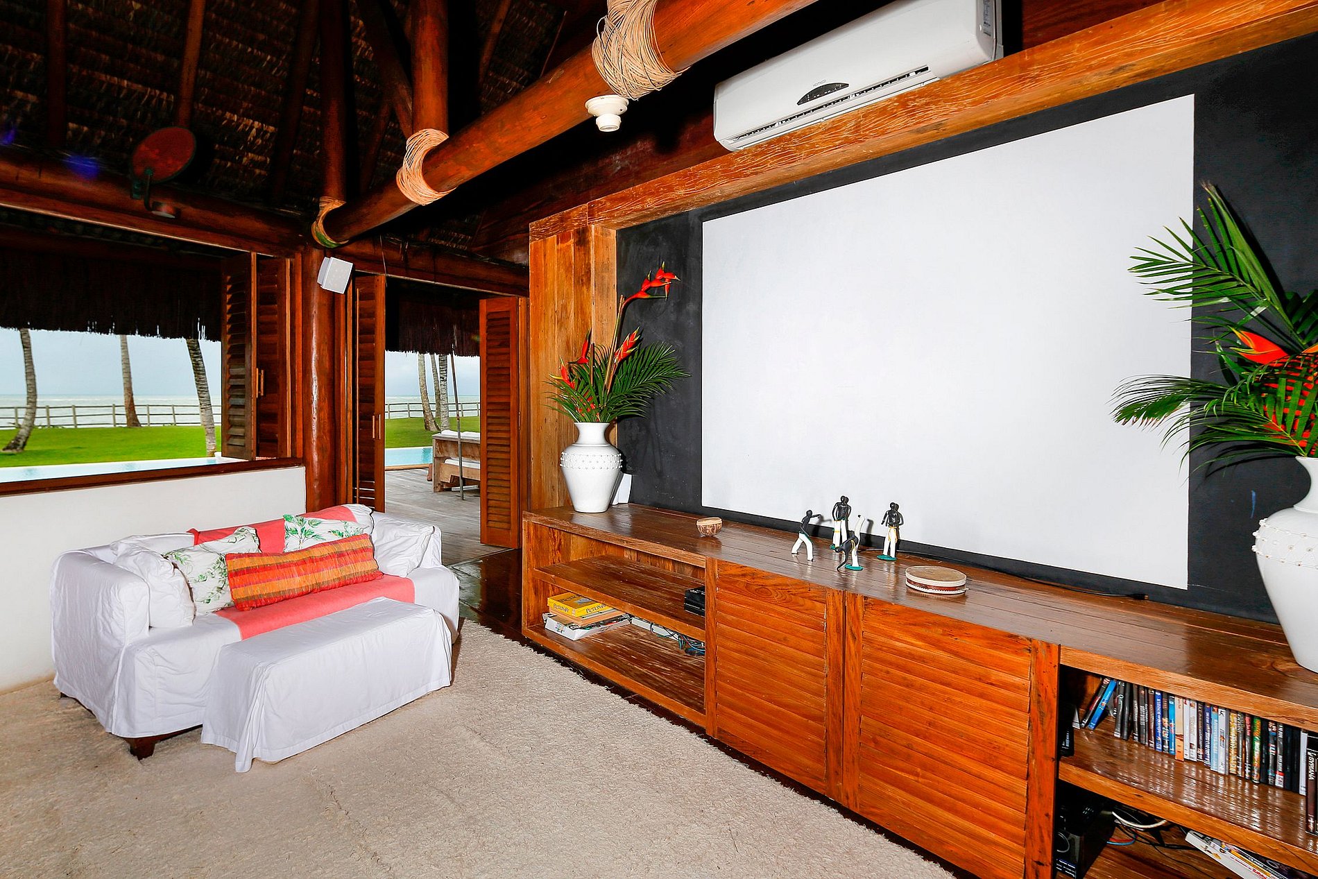 From there, you will follow a small wooden bridge built over the river that crosses the heart of the property to reach the spacious living room and home-cinema room, overlooking the sea.