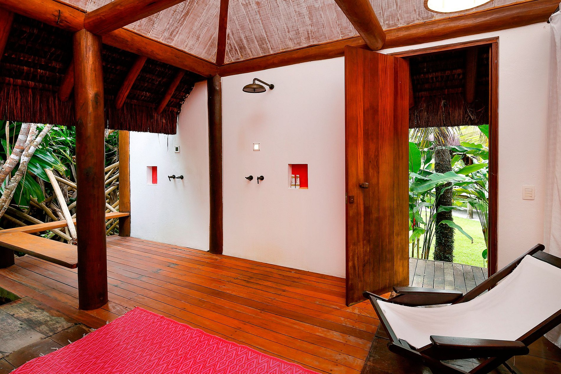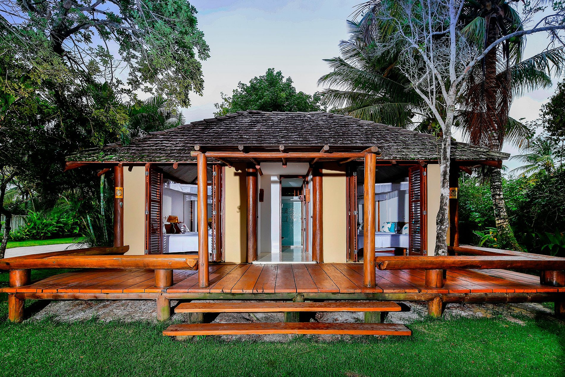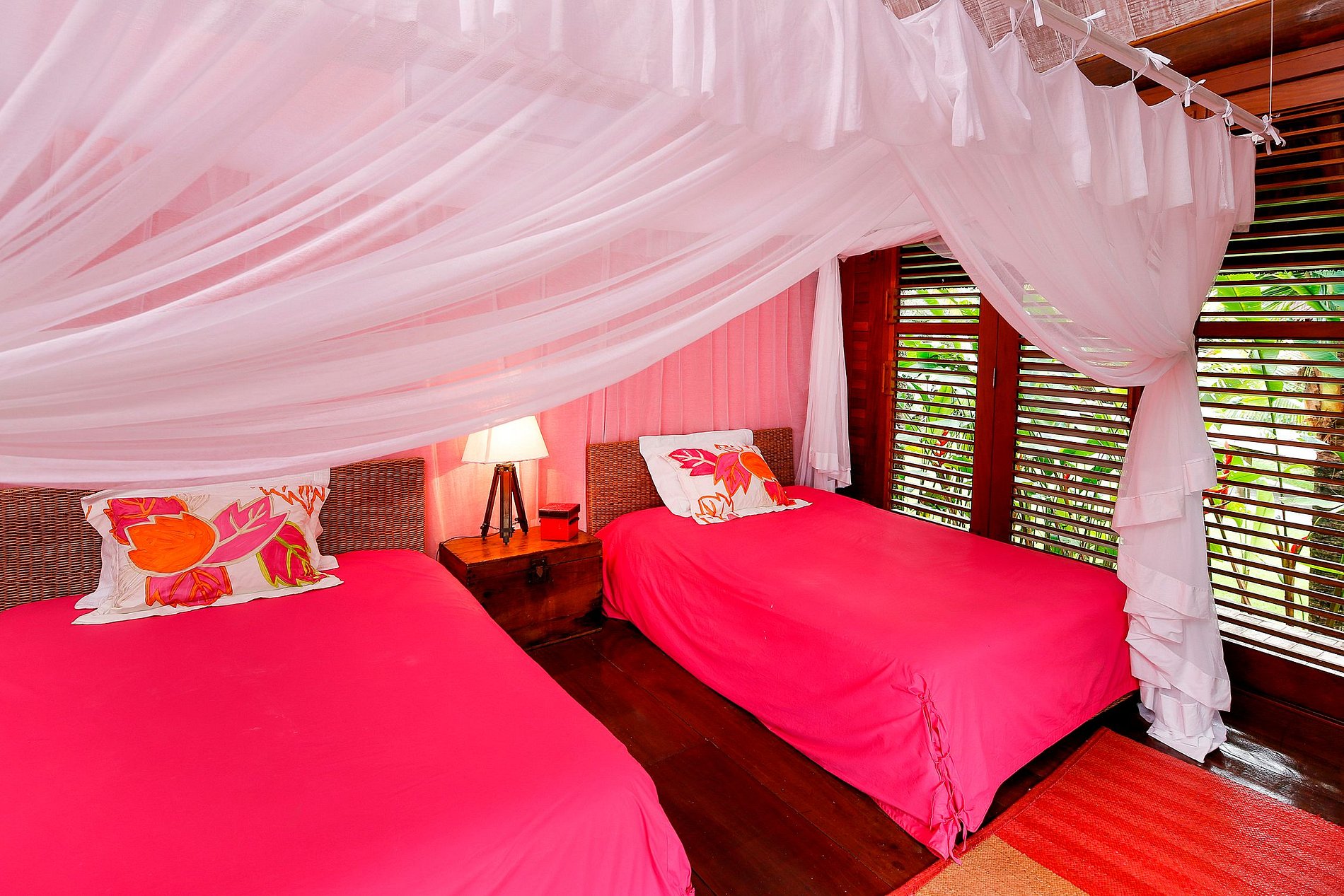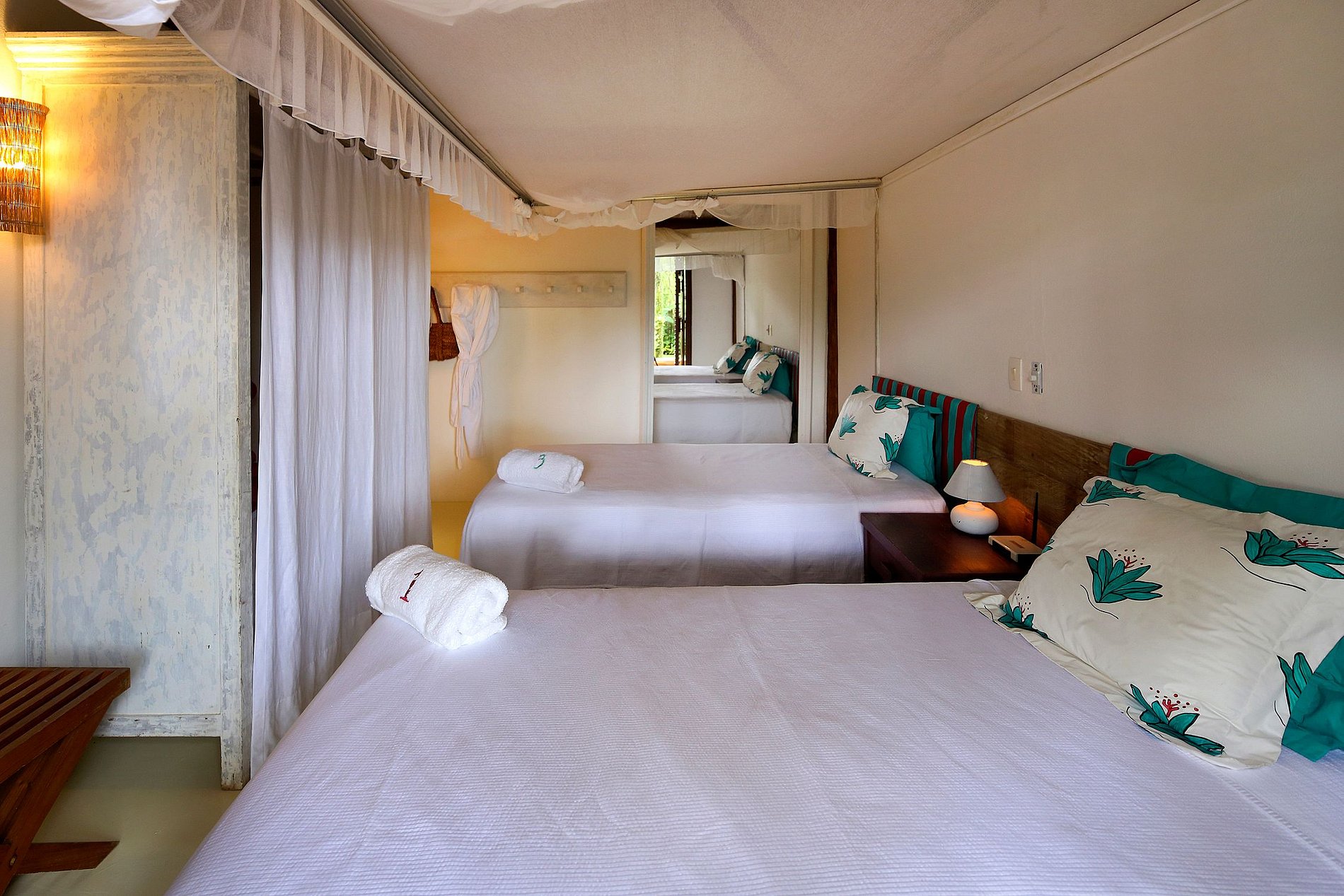In the garden, 3 charming bungalows offer 01 suite each, with a bathroom open to the lush vegetation, indoor/outdoor showers and a large balcony overlooking the sea and/or river. Each of these 3 suites has 2 single beds that can be assembled into a comfortable Queen-Size bed.