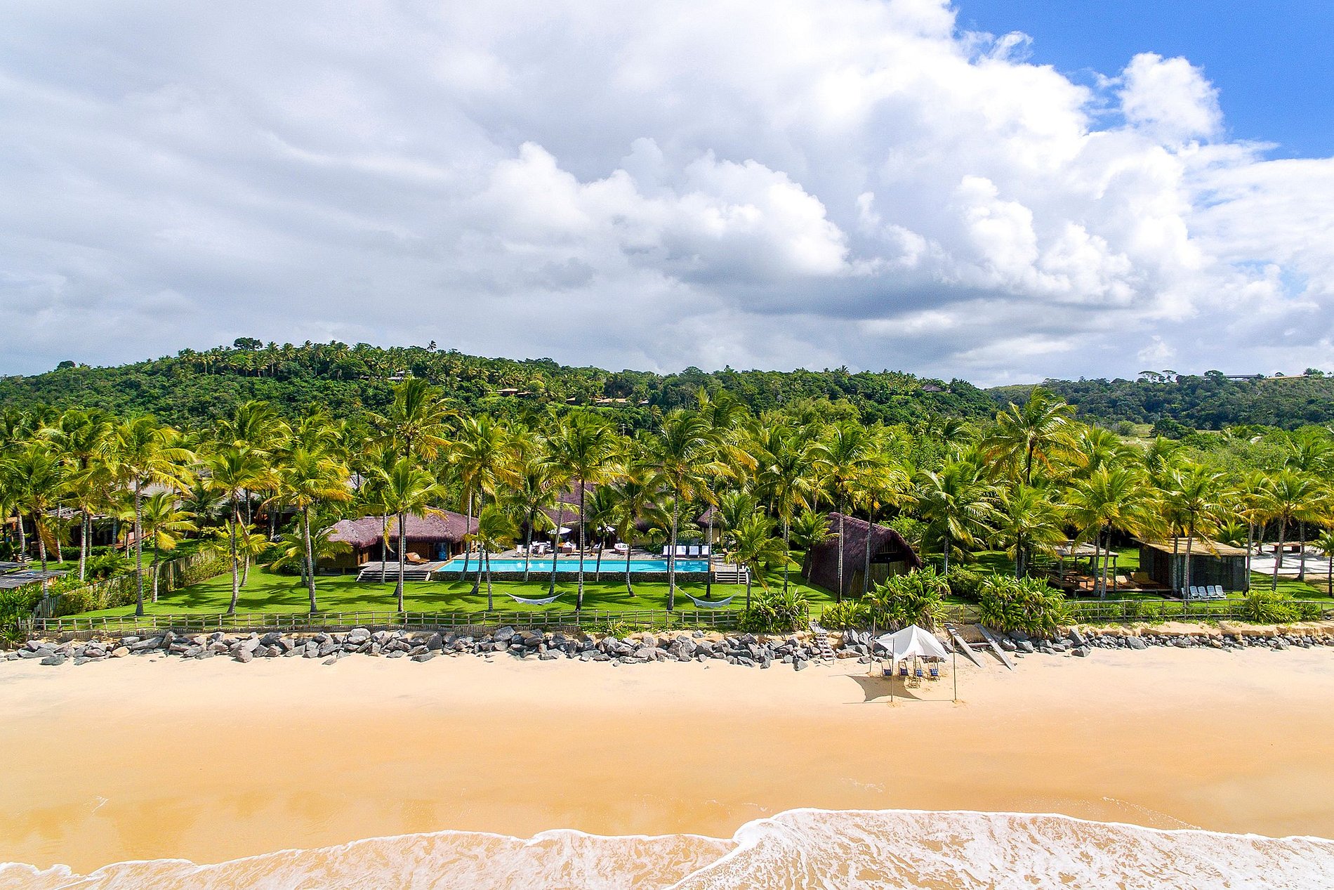 The beach lounge is set up with chairs, tables and a tent to enjoy the sunny days of southern Bahia.