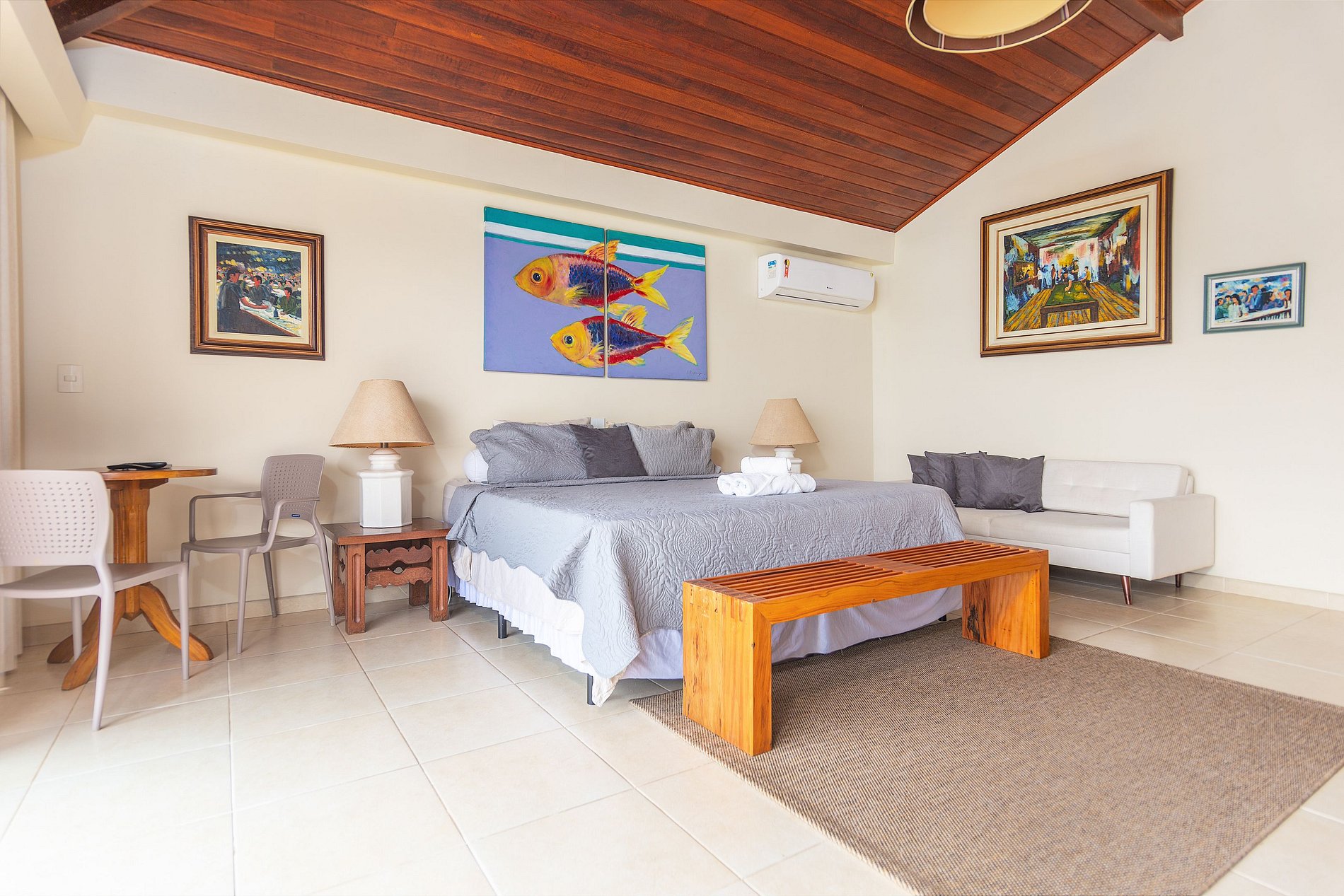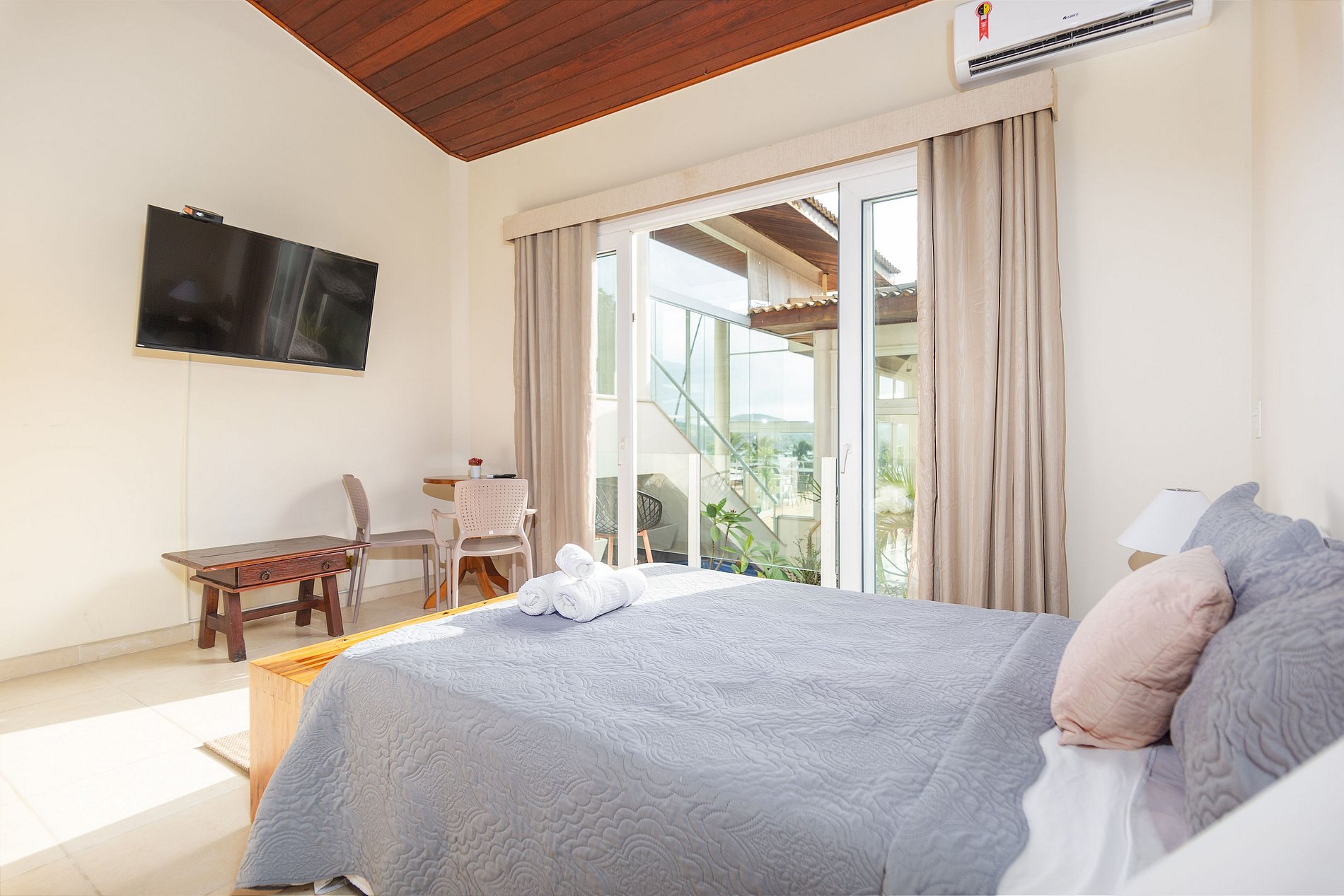 • Sala de estar: ampla e iluminada, com sofá confortável, TV e vistas deslumbrantes para a Praia da Ferradura.
