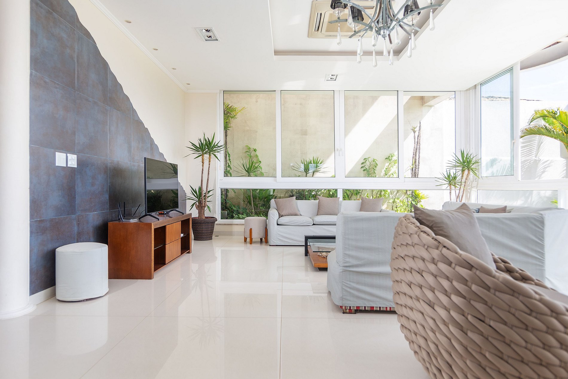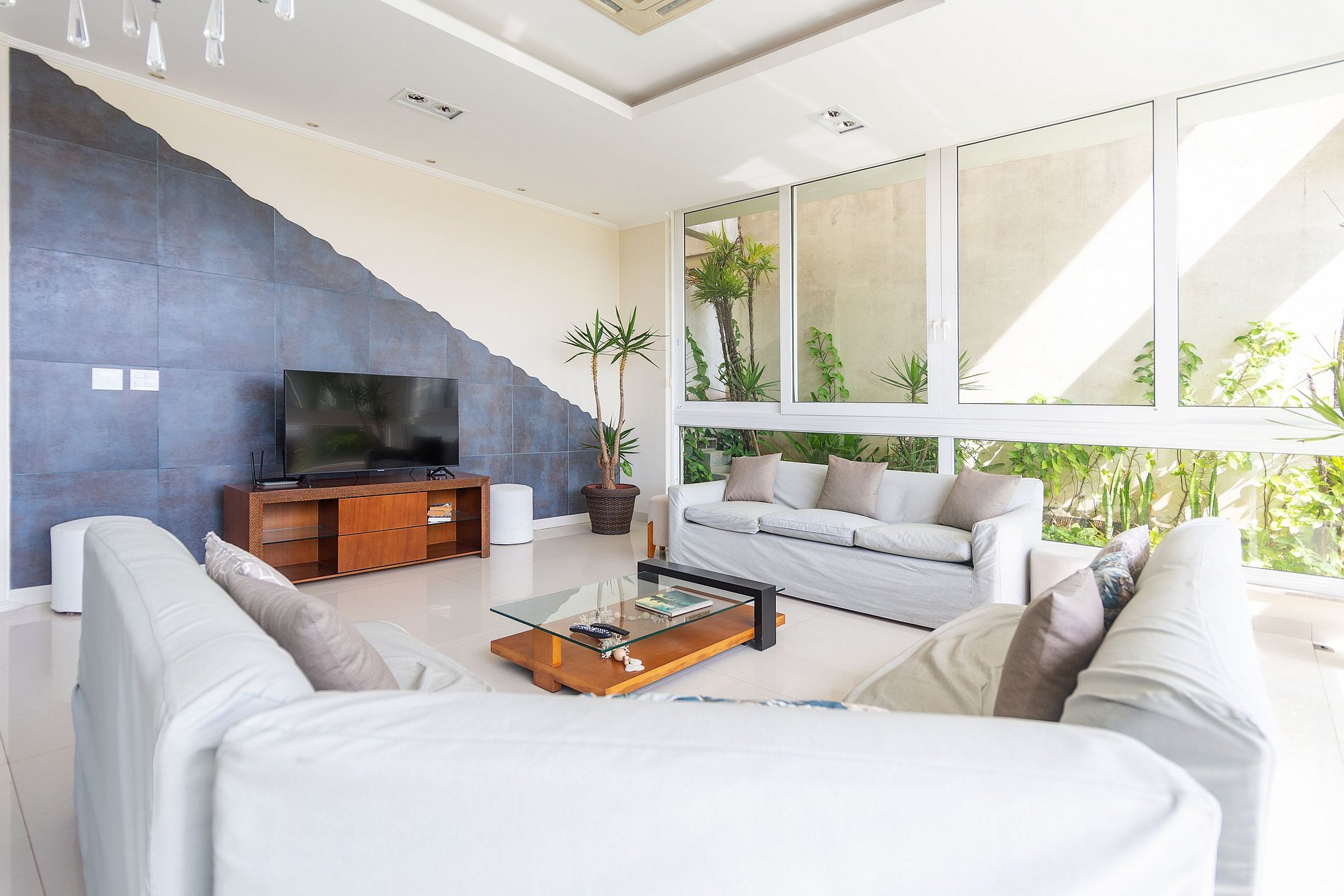 • Sala de estar: ampla e iluminada, com sofá confortável, TV e vistas deslumbrantes para a Praia da Ferradura.