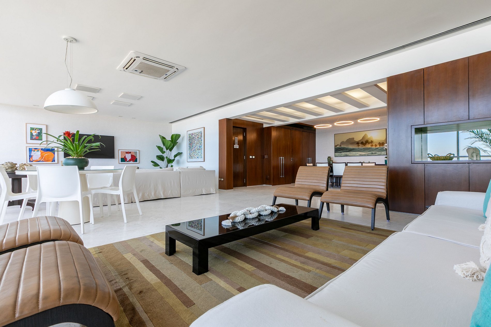 The bright and spacious living room seamlessly integrates with the panoramic view of Ipanema Beach, creating a perfect space for relaxation or entertaining guests. The sophisticated décor and high-end finishes enhance the living experience, while the ocean breeze and natural light make every moment even more special.