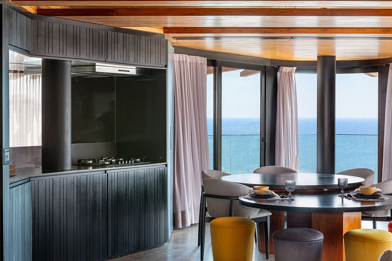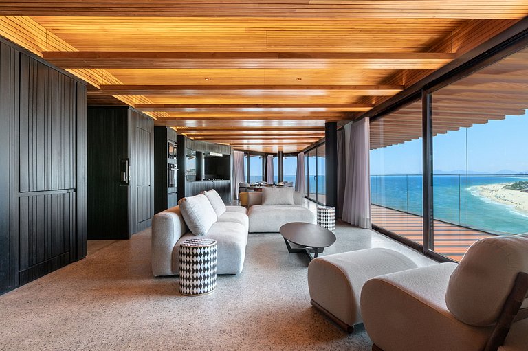 Inspired by the sensation of a grand cruise ship floating above the sea, the property impresses with its spacious terraces and glass-enclosed spaces that capture the vastness of the horizon. The dynamic scenery of Joatinga, with its crystal-clear waters and majestic cliffs, unfolds before your eyes, while water sports and wildlife add to the daily spectacle of this privileged location.