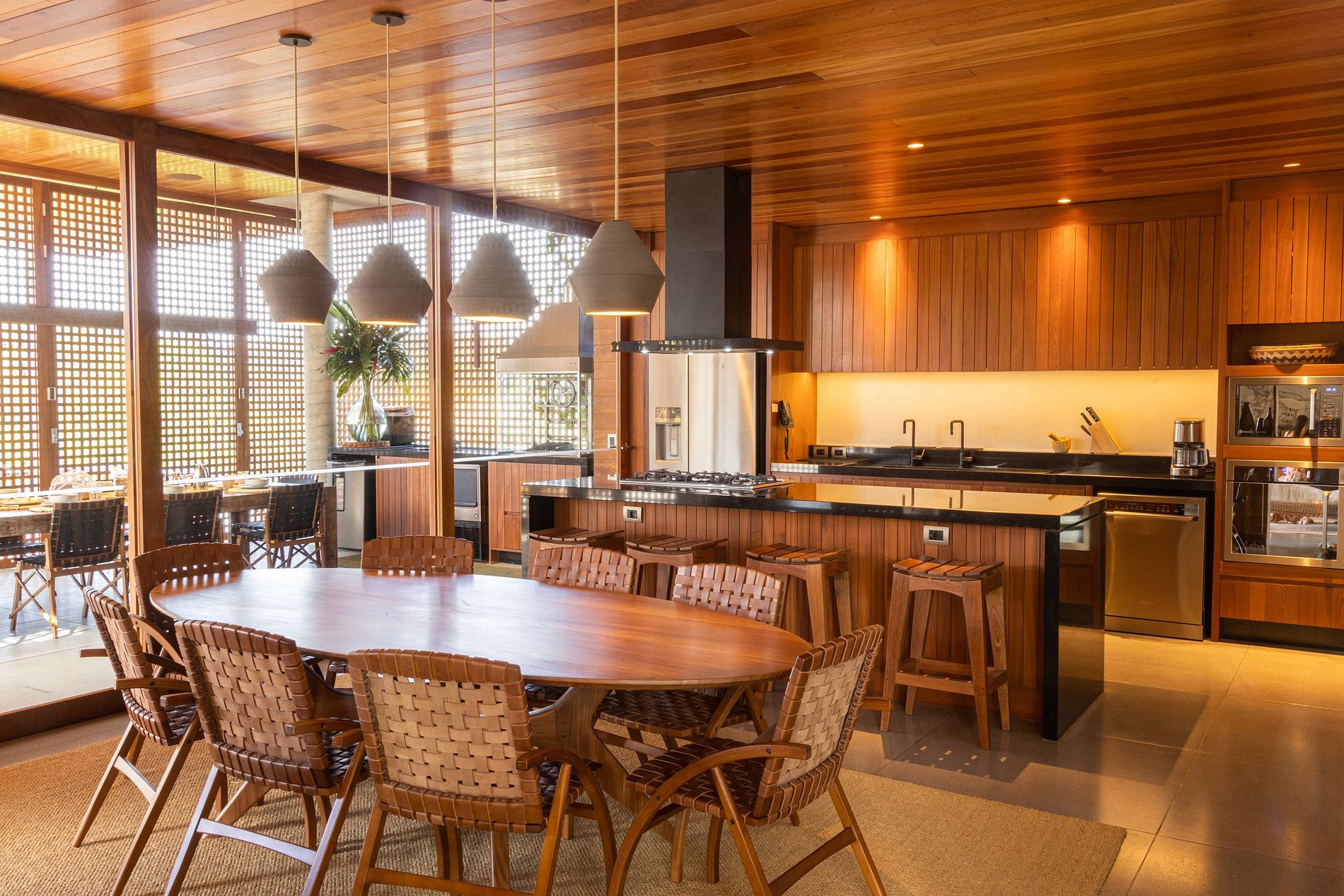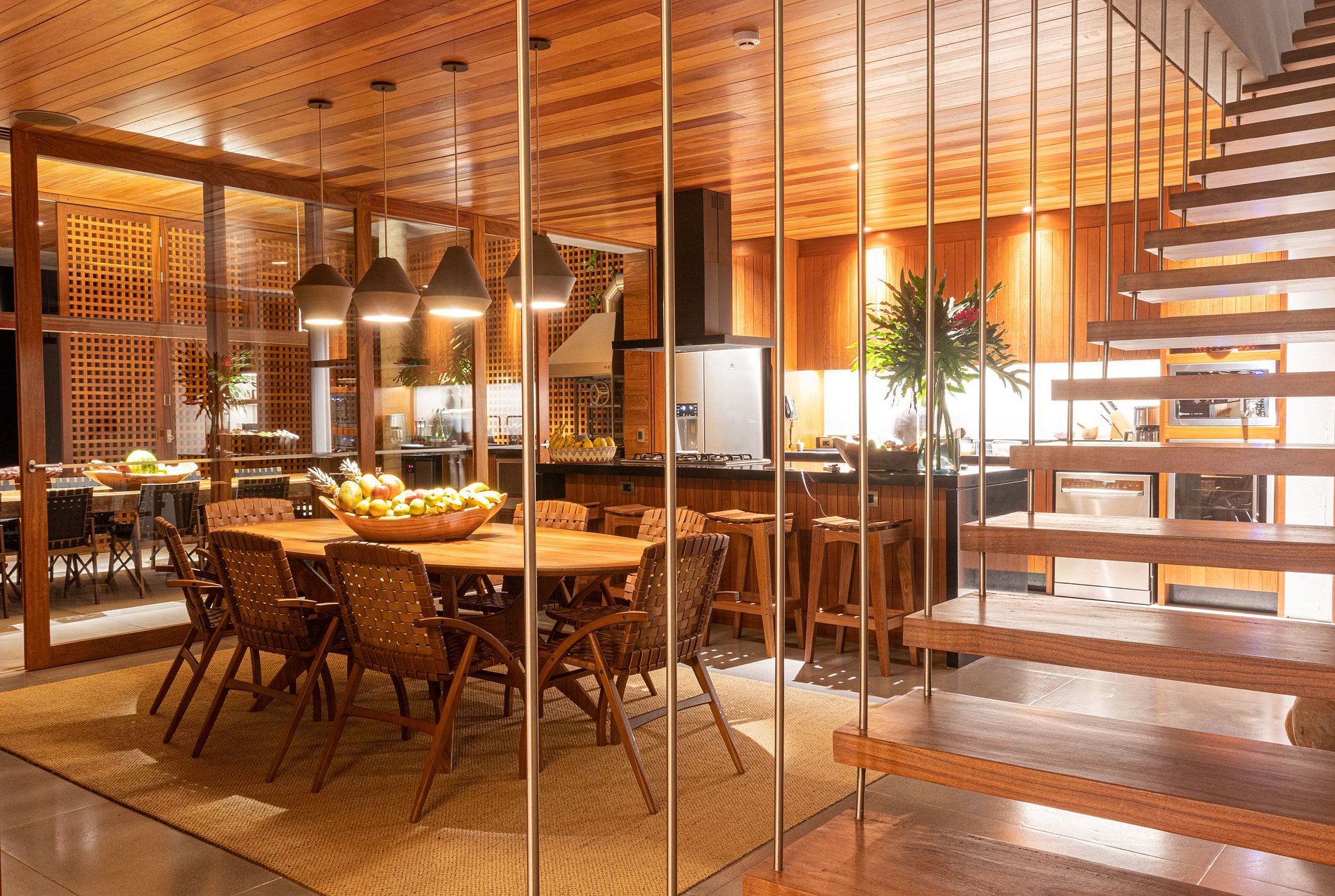 La amplia sala de estar en la planta baja se integra perfectamente con la cocina y la terraza, ofreciendo vistas panorámicas del océano y la Mata Atlántica. Un sistema de sonido Bose de última generación con 12 parlantes en el techo y 6 parlantes externos en las cubiertas realza el ambiente, mientras que el arte en las paredes, elaborado por el artista local Izolag, agrega un toque de autenticidad.