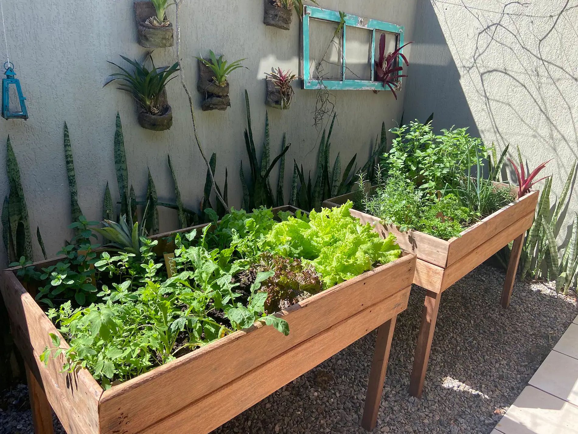 El exuberante jardín tiene palmeras cargadas de cocos, papaya, pimienta rosa y acerola.