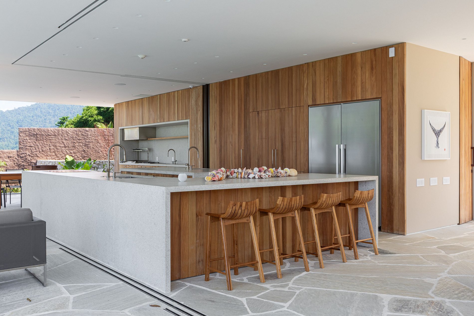 A experiência gastronômica é elevada por equipamentos de alto padrão, incluindo freezer e geladeira Miele, gavetas refrigeradas Sub-Zero, além de uma linha completa Wolf com cooktop a gás com queimador para wok, cooktop de indução e chapa teppanyaki por indução.