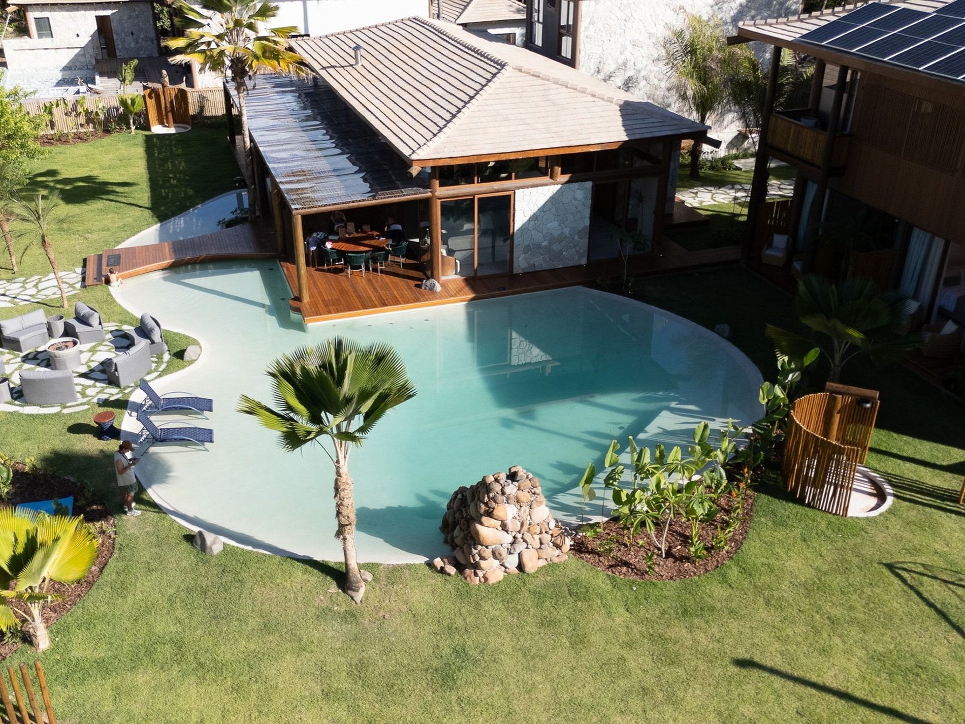 El área externa es uno de los grandes destaques de la propiedad. La piscina de diseño único, con iluminación escénica, evoca una playa privada y crea el escenario perfecto para relajarse, disfrutar del atardecer y vivir momentos inolvidables. El paisajismo tropical, los espacios abiertos y la fogata en el jardín completan la experiencia de descanso y contemplación.