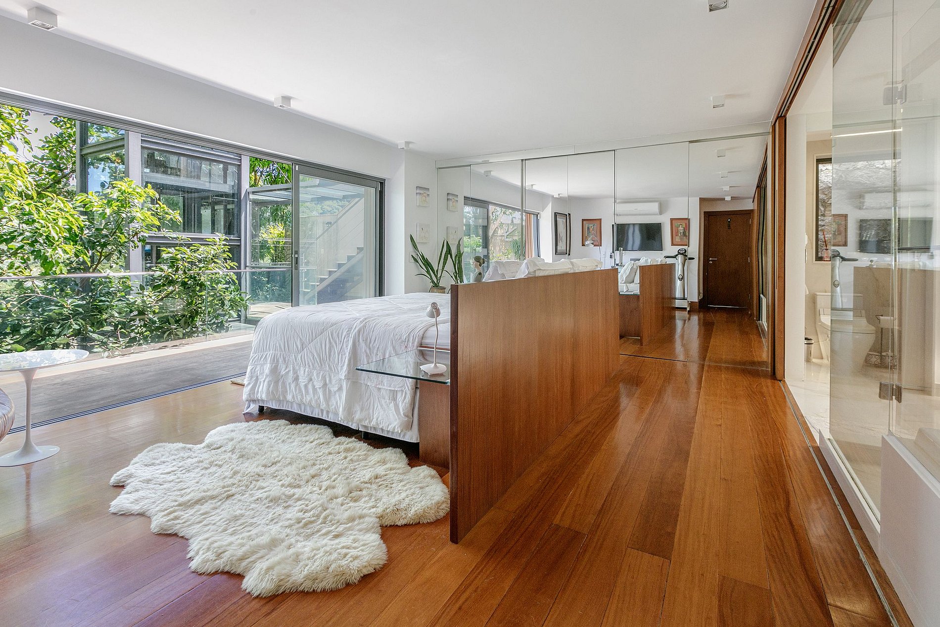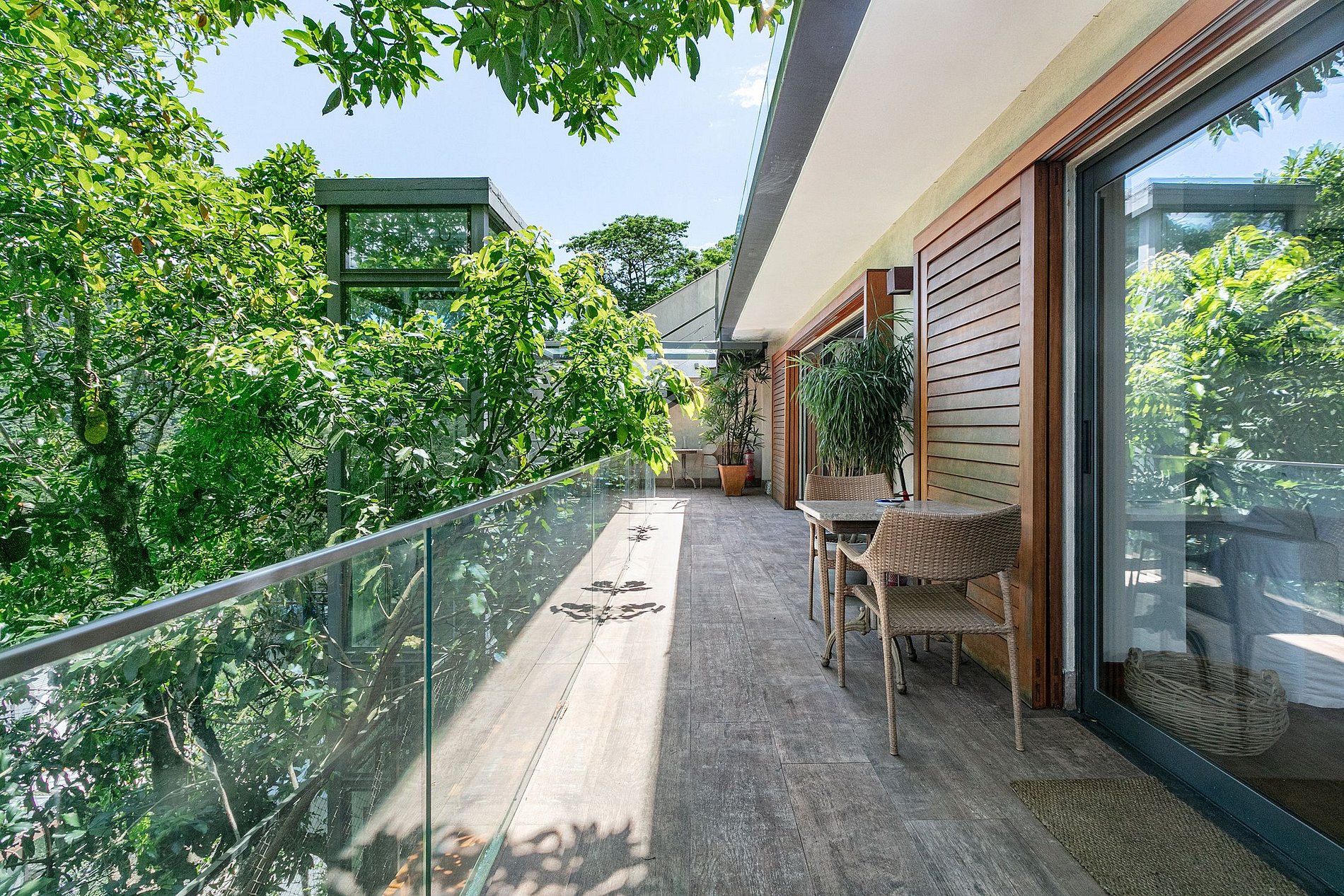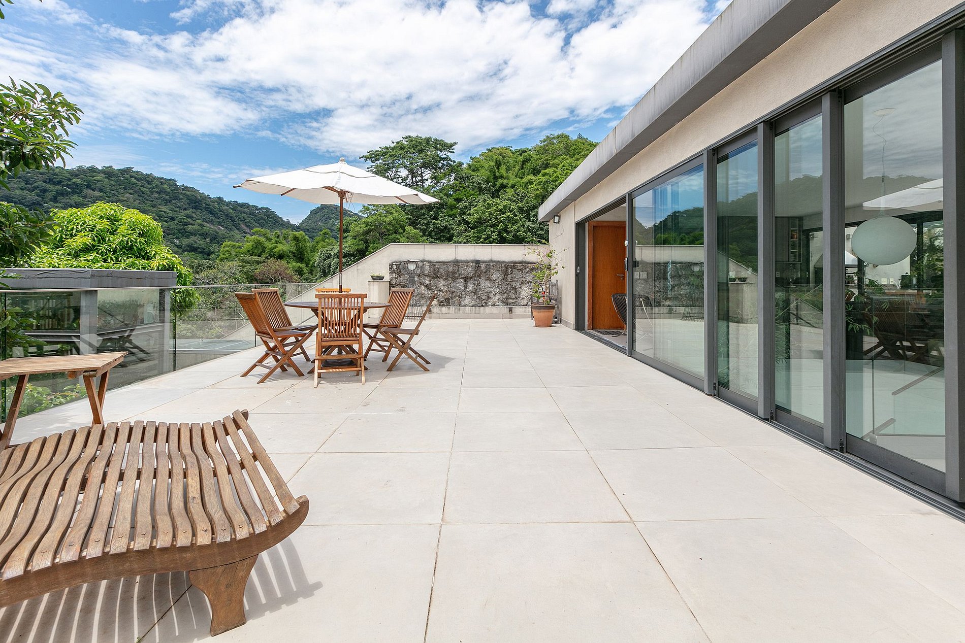 Gracias a sus puertas de cristal, el ambiente interno es muy aireado y con abundante luz. Su piso superior se abre a una encantadora terraza con piscina, asador y una vista privilegiada a la laguna Rodrigo de Freitas, el Cerro Corcovado, el Pan de Azúcar y el propio Jardín Botánico.