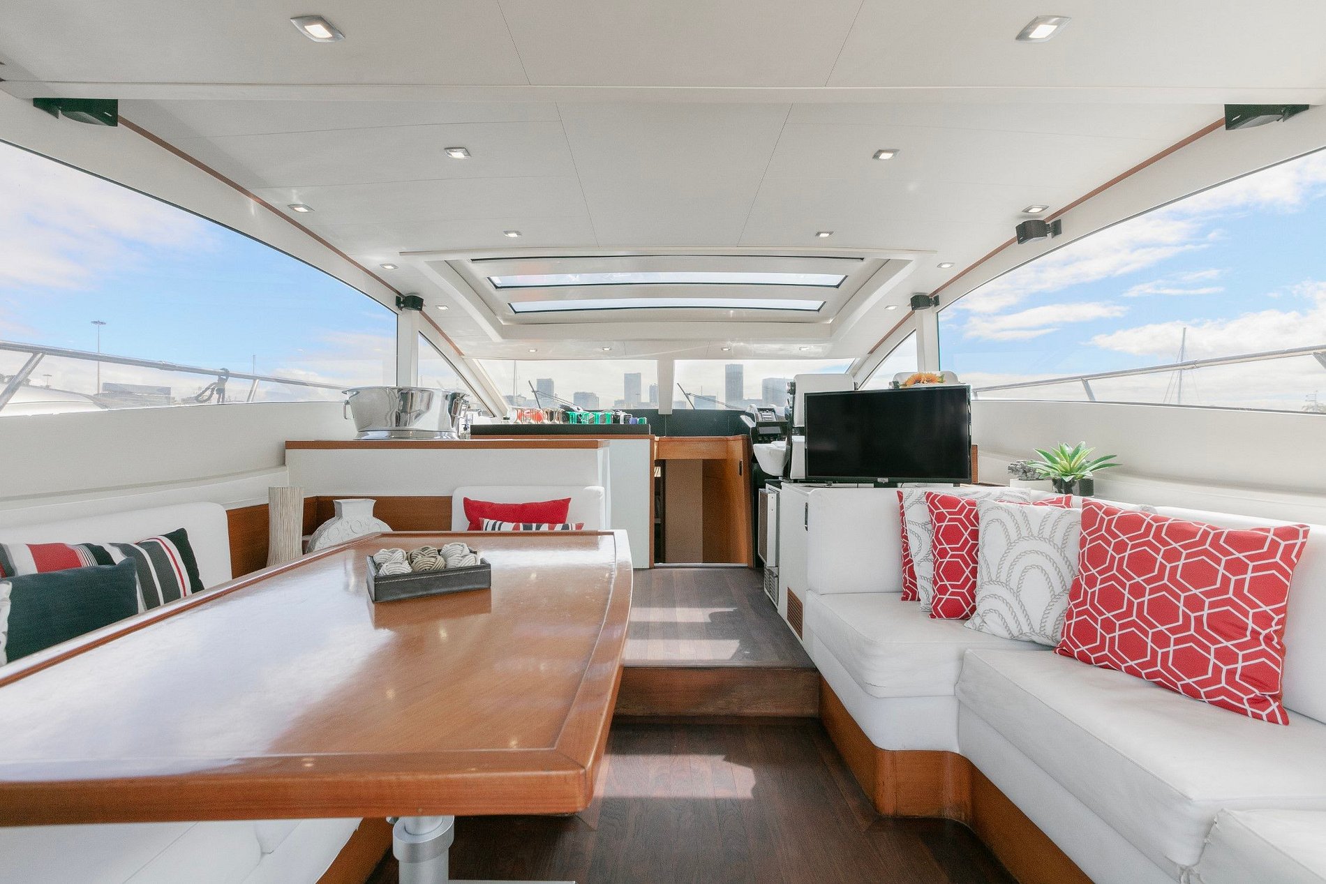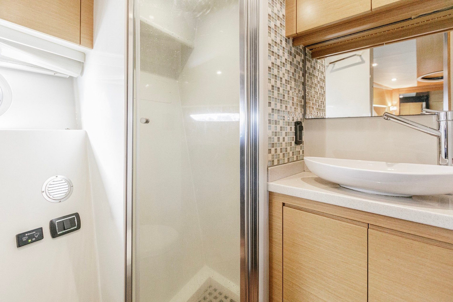 Con dos motores volvo 950 ips, tres dormitorios uno de ellos suite, un camarote simple que también se puede convertir en doble, y un camarote de proa con baño social, cocina completa con dos refrigeradores 2, mini congelador, una cocina eléctrica con microondas, amplia sala con dos sofás, closets en las habitaciones y en la sala, agua caliente en todos los grifos, generador de 15, máquina de hielo, sonido Bluetooth, con automatización independiente en todos los ambientes, asador.