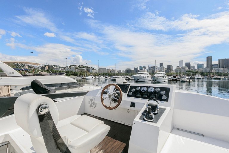 Con dos motores volvo 950 ips, tres dormitorios uno de ellos suite, un camarote simple que también se puede convertir en doble, y un camarote de proa con baño social, cocina completa con dos refrigeradores 2, mini congelador, una cocina eléctrica con microondas, amplia sala con dos sofás, closets en las habitaciones y en la sala, agua caliente en todos los grifos, generador de 15, máquina de hielo, sonido Bluetooth, con automatización independiente en todos los ambientes, asador.