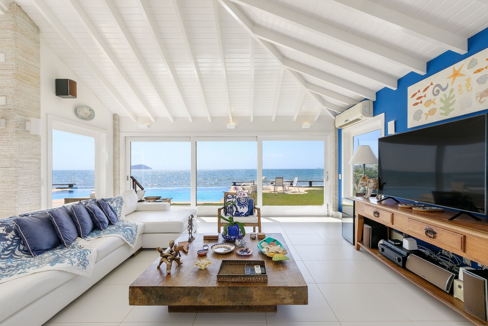 Esta propiedad de 3 suites está situada directamente en el borde de Praia Rasa en Búzios, ofreciendo una vista constante del mar y la conveniencia de acceso directo a la playa. La casa, distribuida en dos plantas, está diseñada con grandes ventanas que permiten la entrada de luz natural y ventilación, creando un ambiente luminoso y aireado.