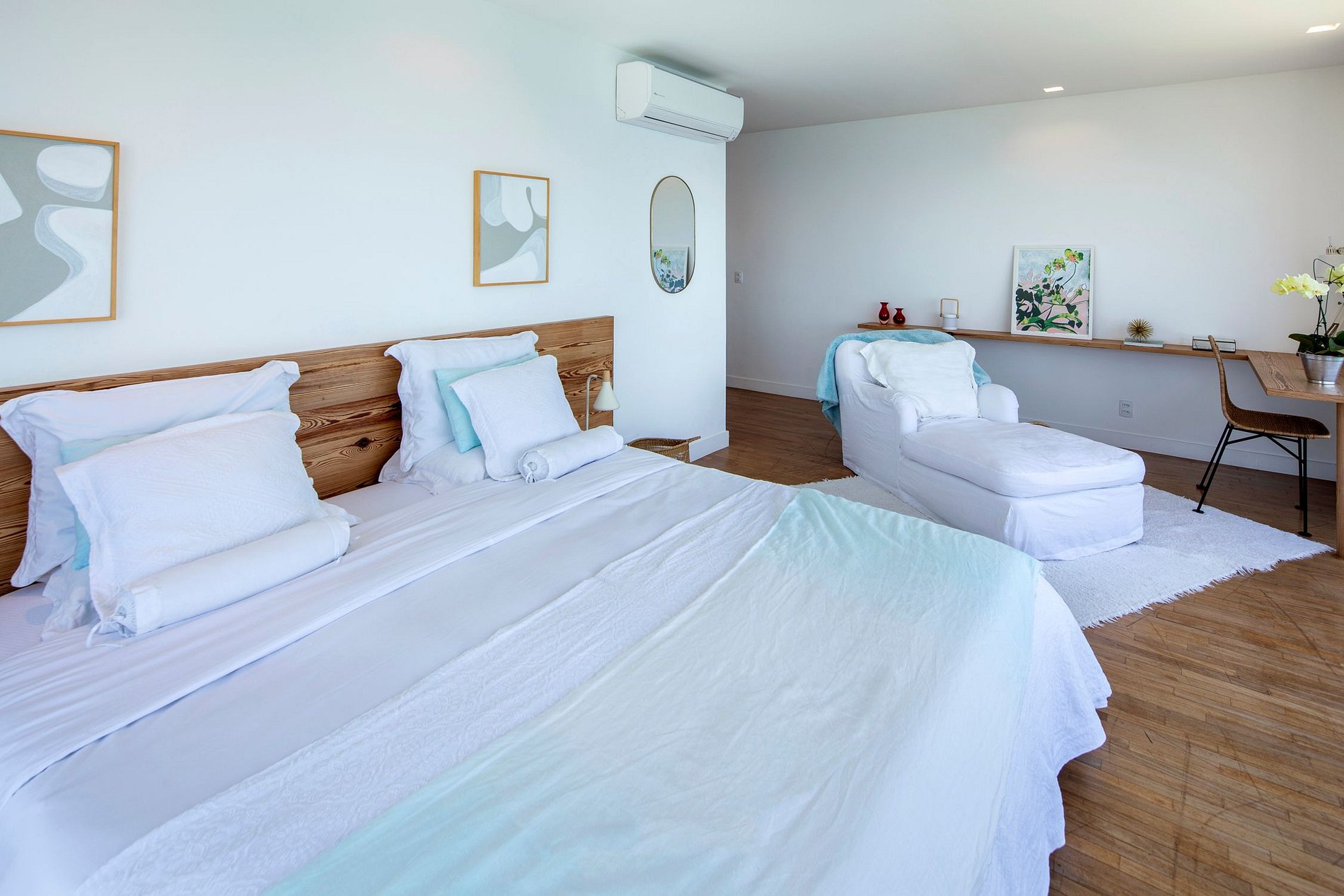 Hay tres excelentes suites con una cama king size con una vista impresionante sobre el mar. También hay una sala de apoyo con dos camas individuales cuyo estándar se puede convertir en una cama doble. Todas las habitaciones son completas, equipadas y cuentan con amenidades de alta gama como almohadas Zissou, sábanas de hilo de bambú, batas y toallas de algodón egipcio, cortinas de lino, TV con canales por cable y Netflix, y vistas inigualables a las Islas Tijuca y Cagarras.