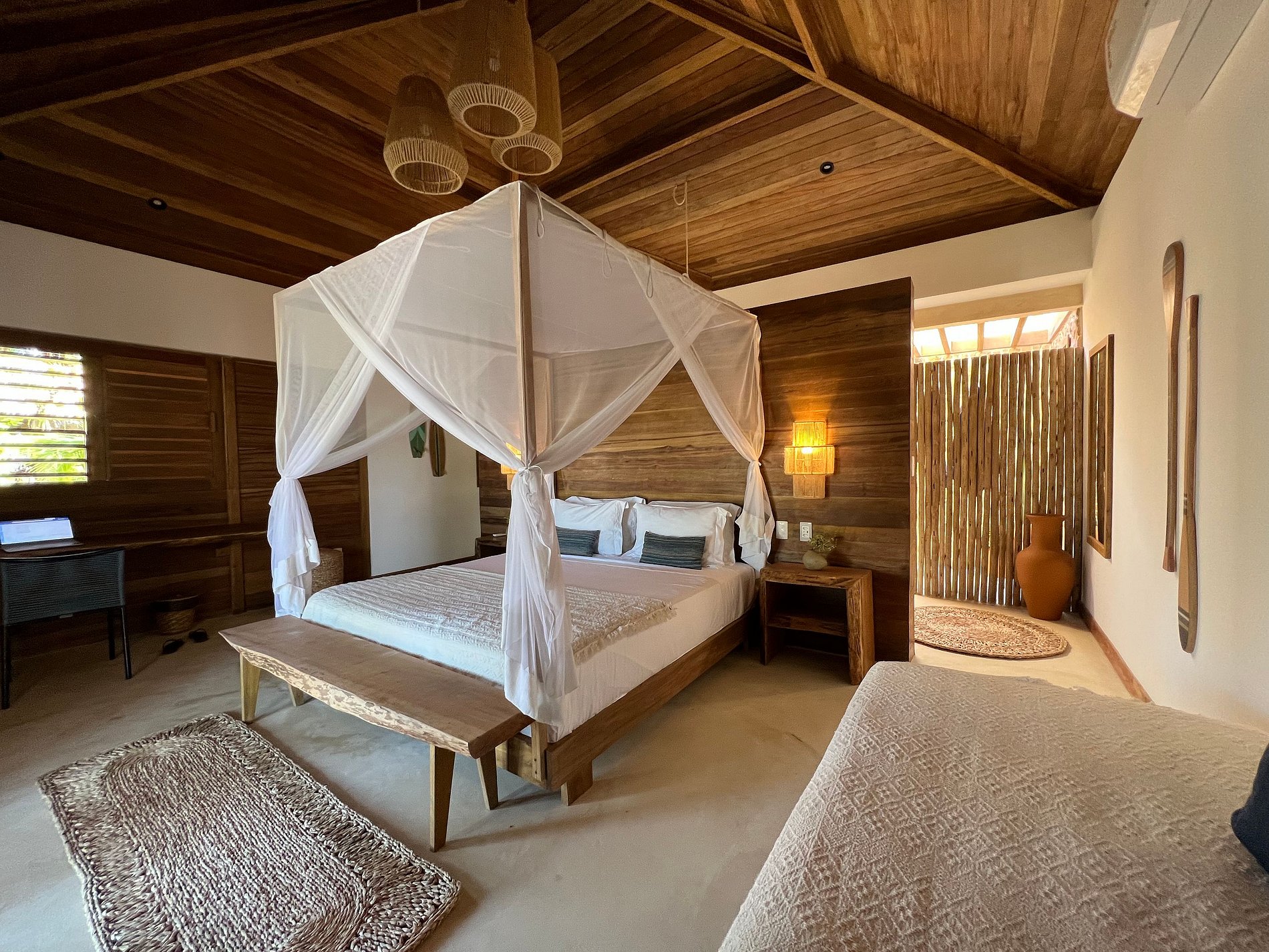 La propiedad cuenta con 8 suites y 2 bungalows exclusivos, todos equipados para garantizar la máxima comodidad. Las suites ofrecen camas king size de alta calidad, aire acondicionado, ventiladores, cortinas opacas, minibar y Wi-Fi de alta velocidad, ideal para quienes necesitan equilibrar el trabajo remoto con momentos de ocio. Las suites se dividen en dos tipos: