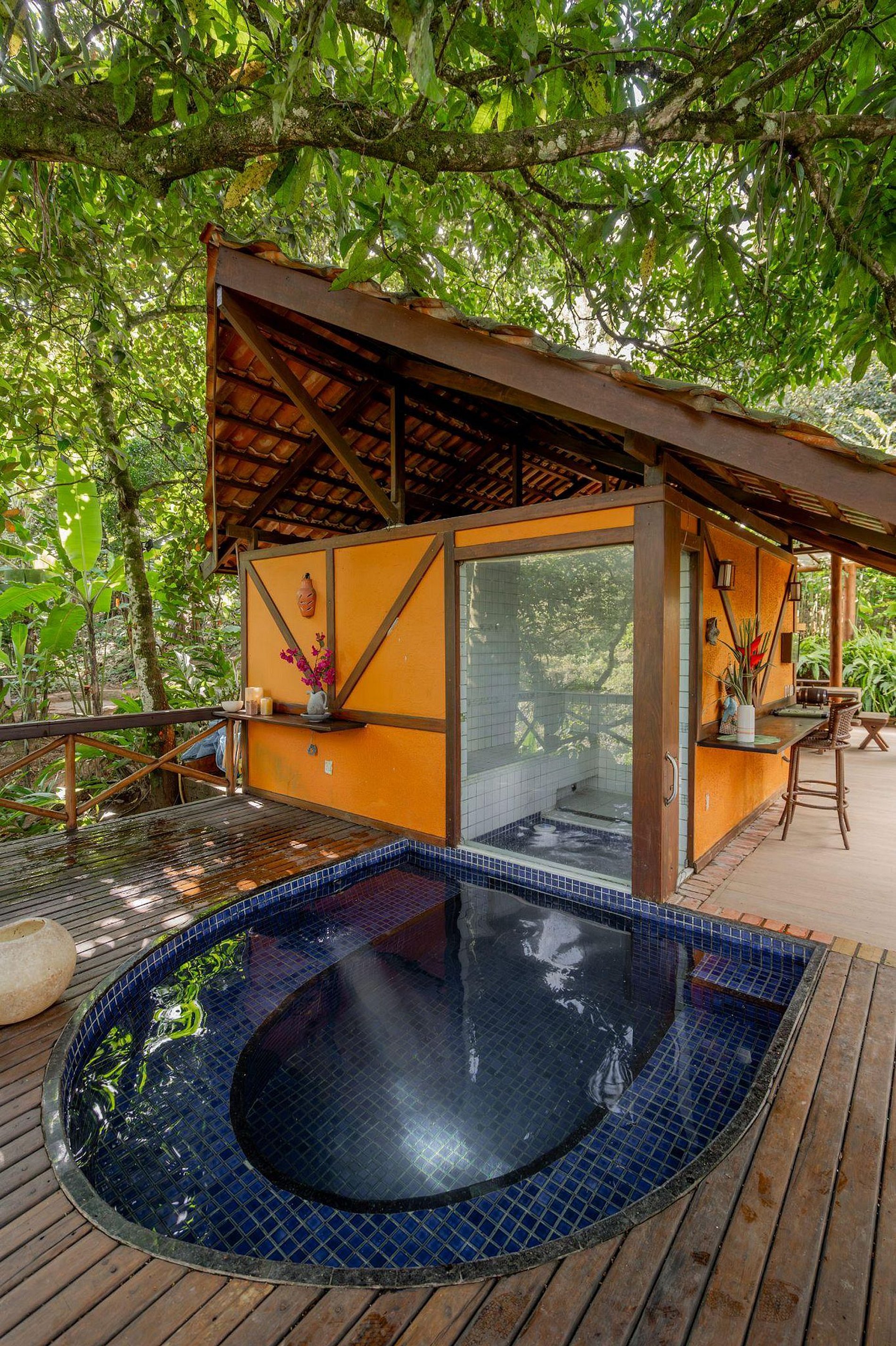 Otra piscina, de piedra natural, con cascada, se encuentra en un ambiente bucólico bajo los árboles, ideal para reconectar con la naturaleza. La casa ofrece también comodidades modernas, como Wi-Fi de alta velocidad, smart TV, un juego completo de sábanas, cocina totalmente equipada con electrodomésticos de última generación y un área de lavandería con lavadora y secadora.