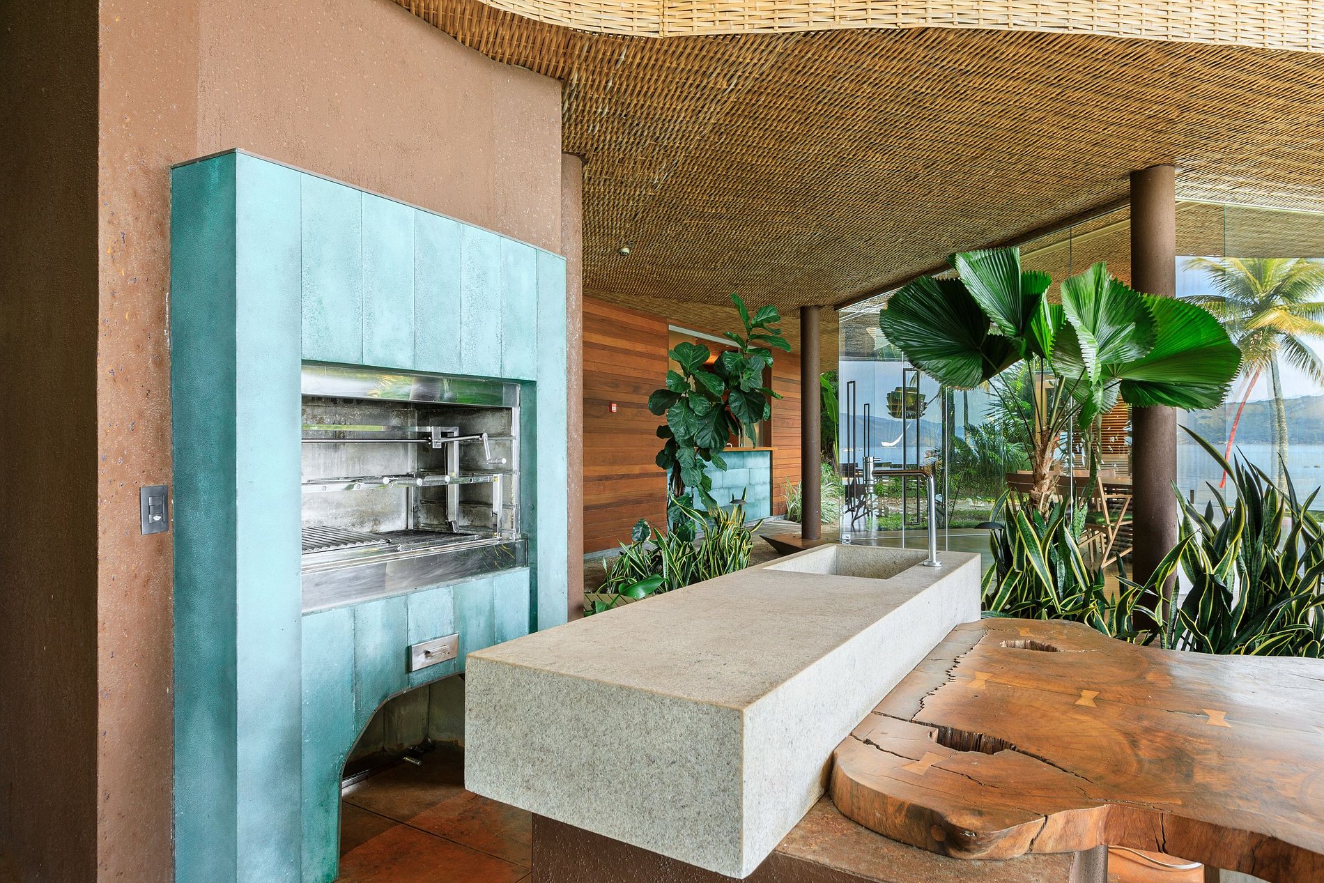 Inspirándose en la arquitectura tradicional de las chozas indígenas brasileñas, los arquitectos Mareines y Patalano diseñaron la gloriosa Casa Folha. Diseñada para causar un bajo impacto ambiental y promover una integración fusional entre los edificios y la naturaleza, la casa que se ha convertido en un ícono, subvierte conceptos comunes y rompe con el lugar común de las casas de playa, por ejemplo, quién hubiera imaginado, una barbacoa exactamente en el centro de la habitación?