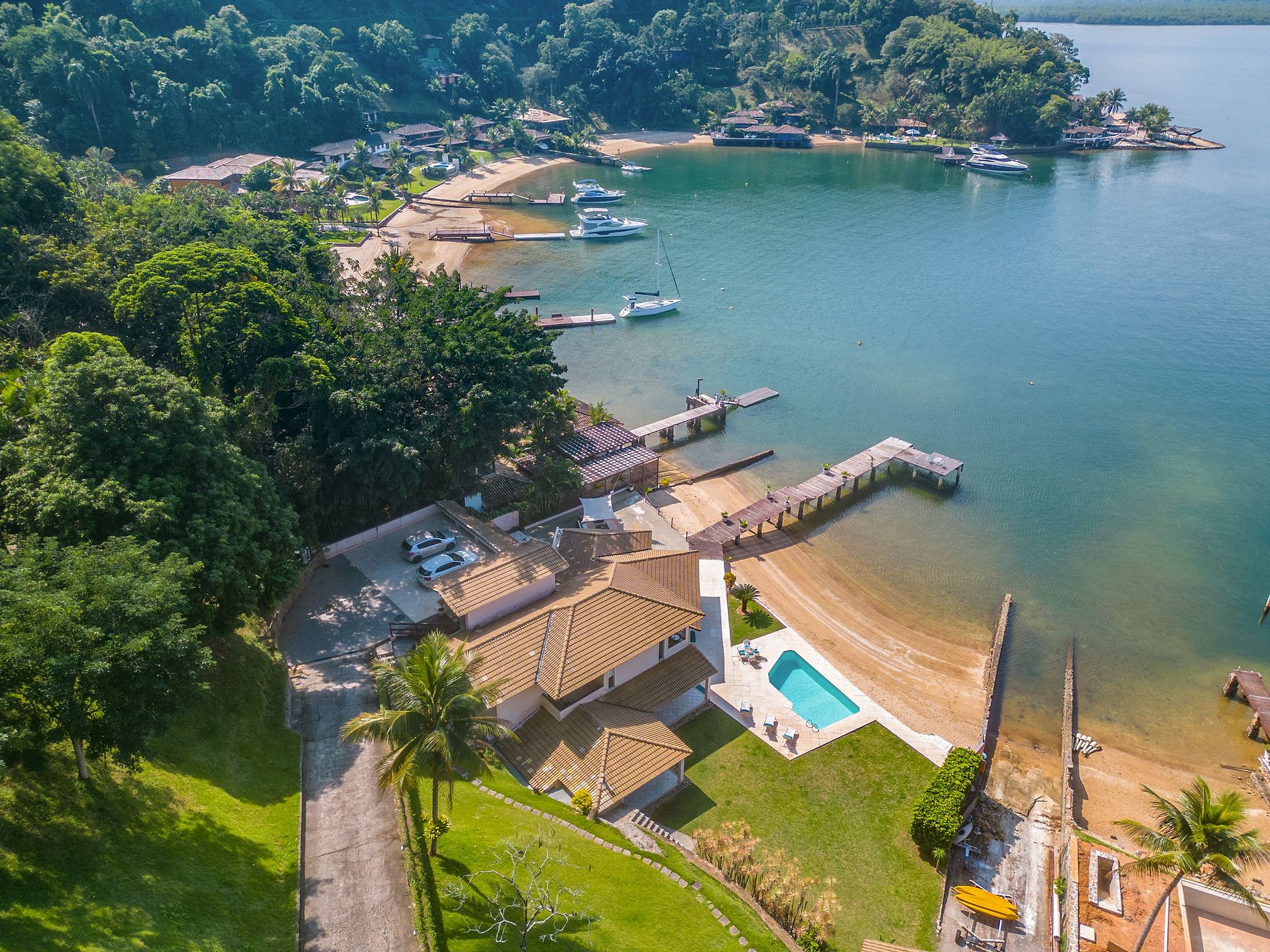 Una casa de estilo típico brasileño frente al mar que cuenta con comedor, sala de estar, piscina, barbacoa, muelle. Una hermosa playa privada justo en frente de usted se enfrenta al mar en calma de Angra dos Reis.