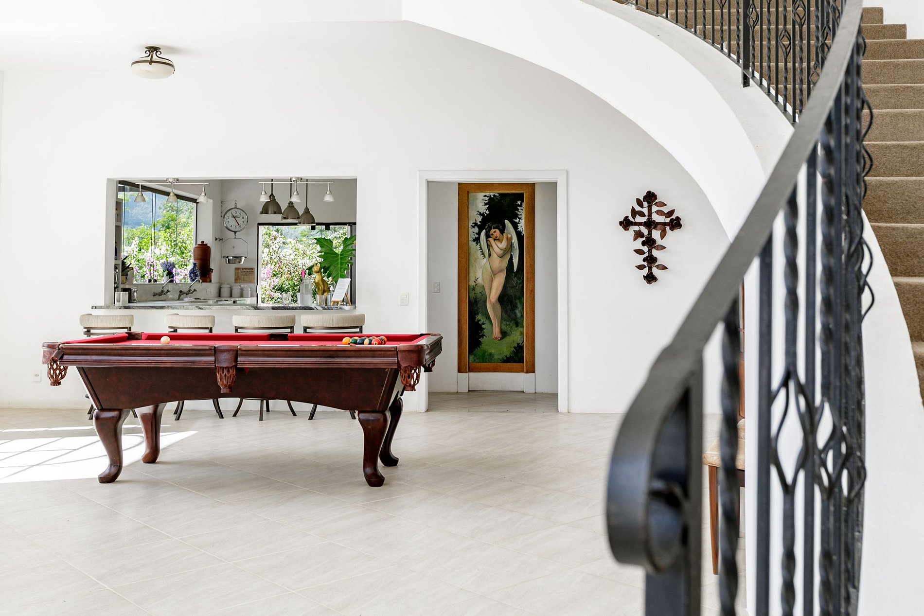Rodeada del colorido cultivo de las más variadas especies de flores, se encuentra una hermosa casa con enormes ventanales de vidrio que permiten la entrada de luz natural y forma hermosos diseños y sombras en todas sus estancias. Desde las grandes puertas adornadas con cuadros pintados a mano, se extiende el salón y el comedor, completo con una mesa de billar, y conduce a la elegante y muy bien equipada cocina situada en la parte trasera. Los techos altos aportan una sensación de amplitud y confort. Todos los ambientes fueron delicadamente decorados con piezas encontradas en todo el mundo, suites sumamente espaciosas, camas súper cómodas, balcones con vista al verde en todas las habitaciones y todo lo necesario para promover, quienes se hospedan aquí, estaciones increíblemente tonificantes.