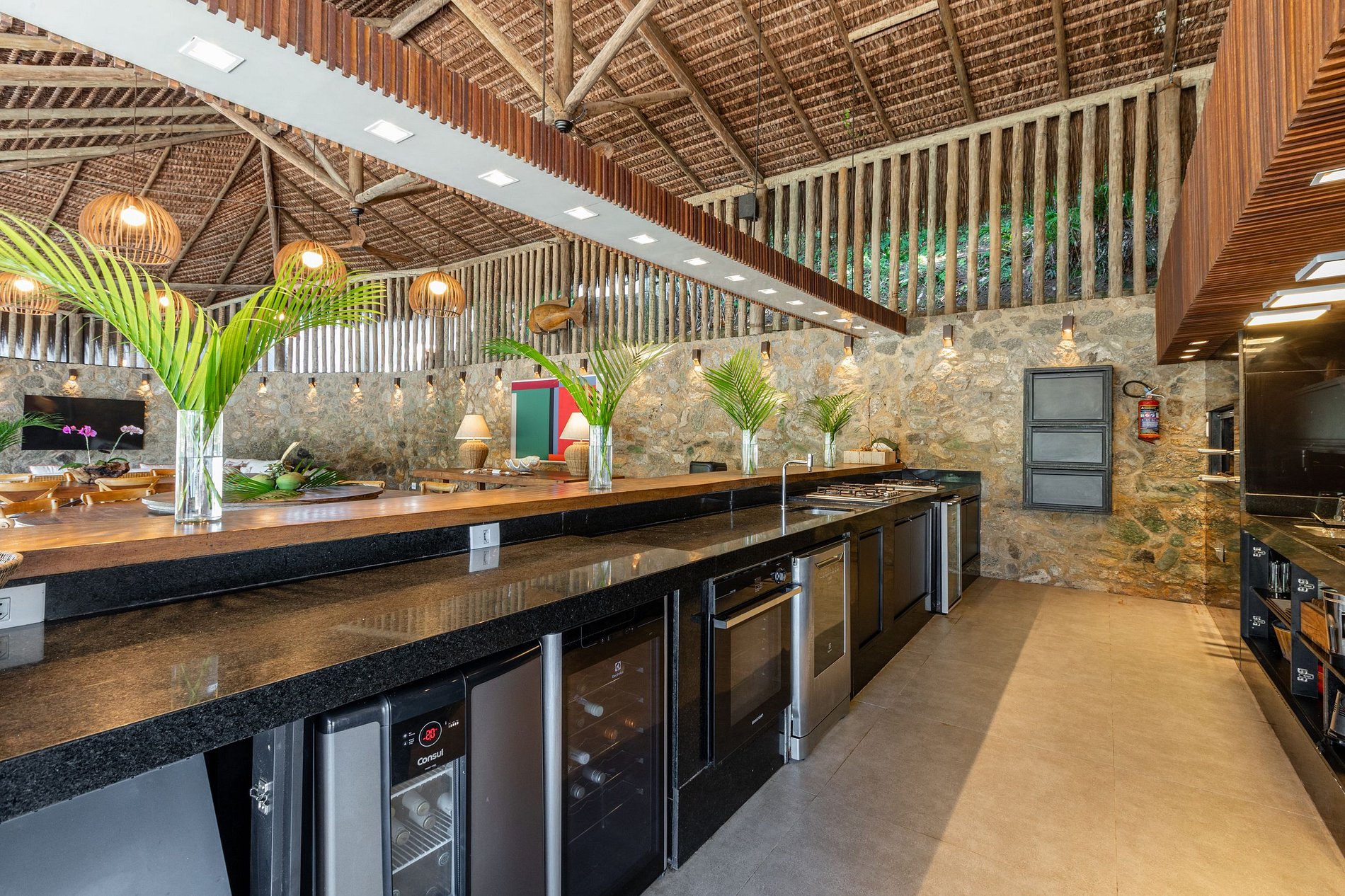 El área gourmet es amplia y está completamente equipada con parrilla, cocina a gas, heladeras, chopera, máquina de hielo, cocina interna y una encantadora cocina a leña con horno de pizza.
