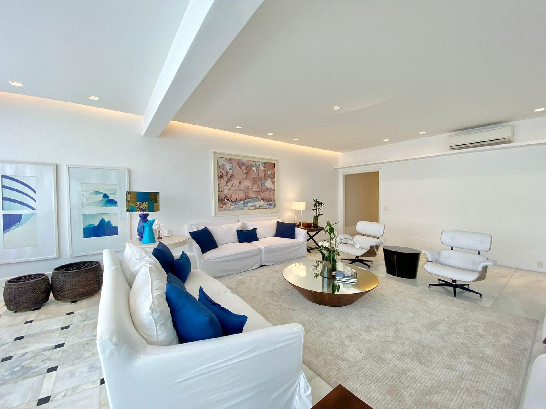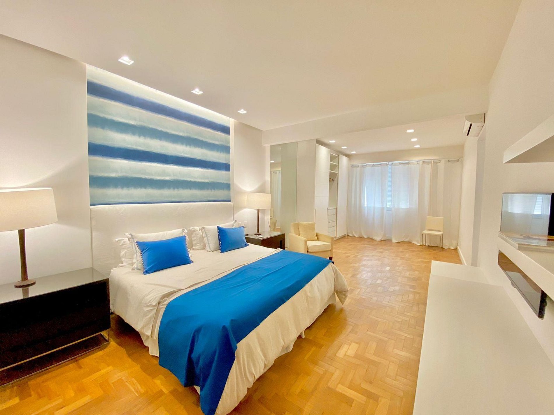 El apartamento cuenta con siete aires acondicionados distribuidos estratégicamente, garantizando el máximo confort en todas las áreas. La suite principal impresiona por su generoso tamaño, acabados de alta calidad y una decoración inspirada en los tonos del mar, evocando la tranquilidad de las playas cariocas.