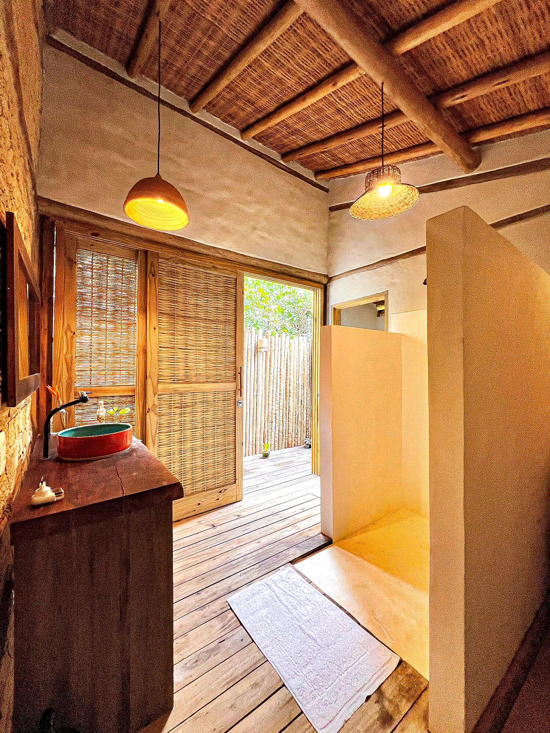 La arquitectura rústico-minimalista con detalles en cemento pulido, madera y barro conecta el interior con la exuberante vegetación local. Las puertas de vidrio permiten que la luz natural y el entorno verde se integren perfectamente en los espacios. La decoración incluye piezas artesanales de cerámica y cestería típica.