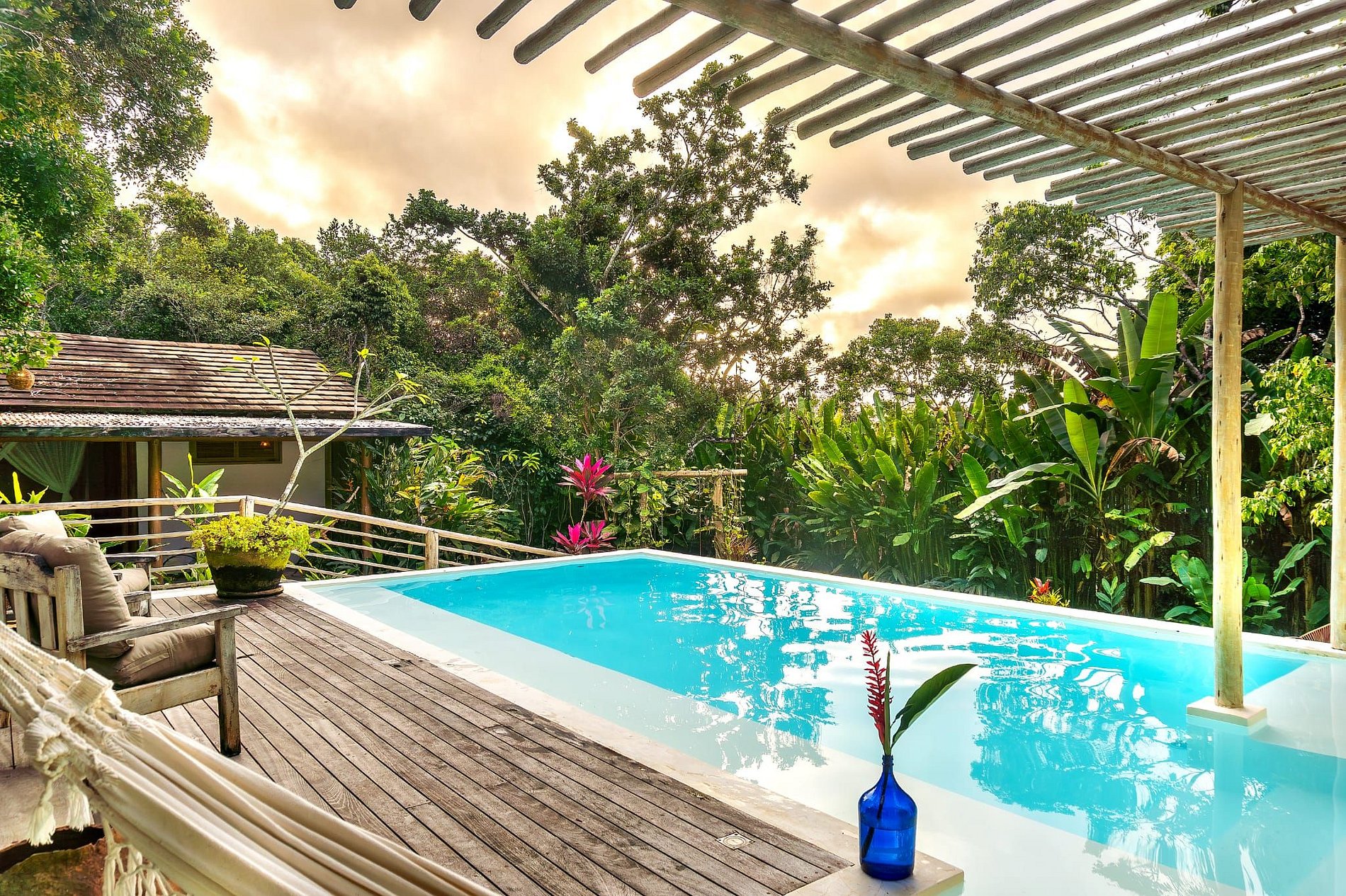 La piscina rodeada de árboles, con red, pérgola y zona de barbacoa portátil, complementa el amplio jardín. El bungalow independiente con dos suites garantiza máxima privacidad. La casa cuenta con tres suites internas (una master con cama king y ducha exterior), salón acogedor y cocina completamente equipada.
