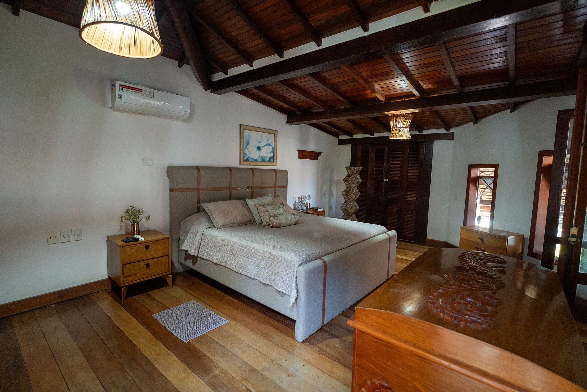 Con una distribución inteligente en dos plantas, la casa ofrece alojamiento cómodo para diversos perfiles de huéspedes. Cuenta con siete suites bien distribuidas, con camas Queen, King, matrimoniales e individuales, además de una habitación adicional con cama Queen. Esta versatilidad permite recibir con total comodidad y privacidad a familias grandes, grupos de amigos o incluso eventos privados.