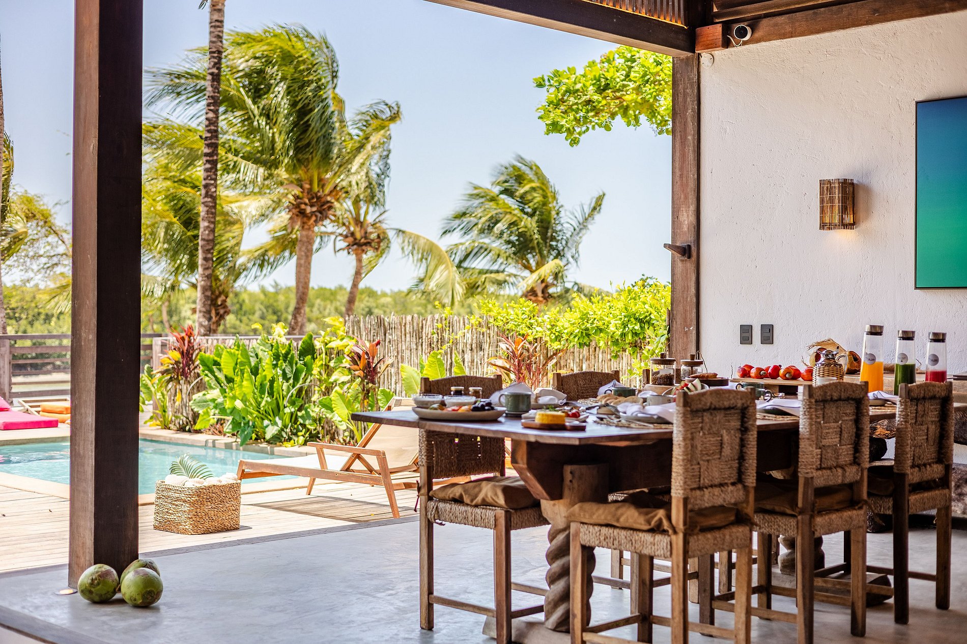 Cuenta con tres amplias suites independientes, decoradas con piezas de artesanos locales, camas confortables, aire acondicionado y baños privados. Algunas tienen deck y bañera exterior; otras, vistas directas al jardín o al delta. Las áreas comunes están completamente integradas con el entorno: salón con los pies en la arena, cocina abierta y piscina infinita con vistas al atardecer. La casa fue diseñada para respirar, con ventilación natural y ambientes acogedores.