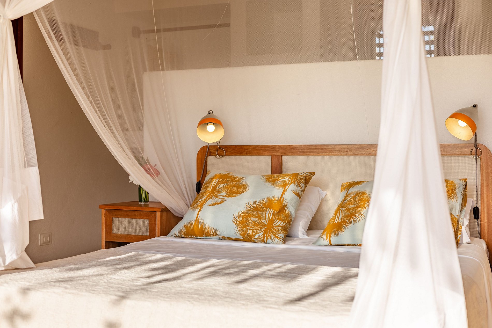 Deux grandes suites sont installées dans un bungalow séparé, garantissant ainsi intimité et tranquillité. Toutes deux disposent de larges portes vitrées donnant un accès direct à la piscine. L’une propose un lit queen size, l’autre deux lits simples. Toutes les chambres sont climatisées, équipées de moustiquaires et d’espaces de rangement.