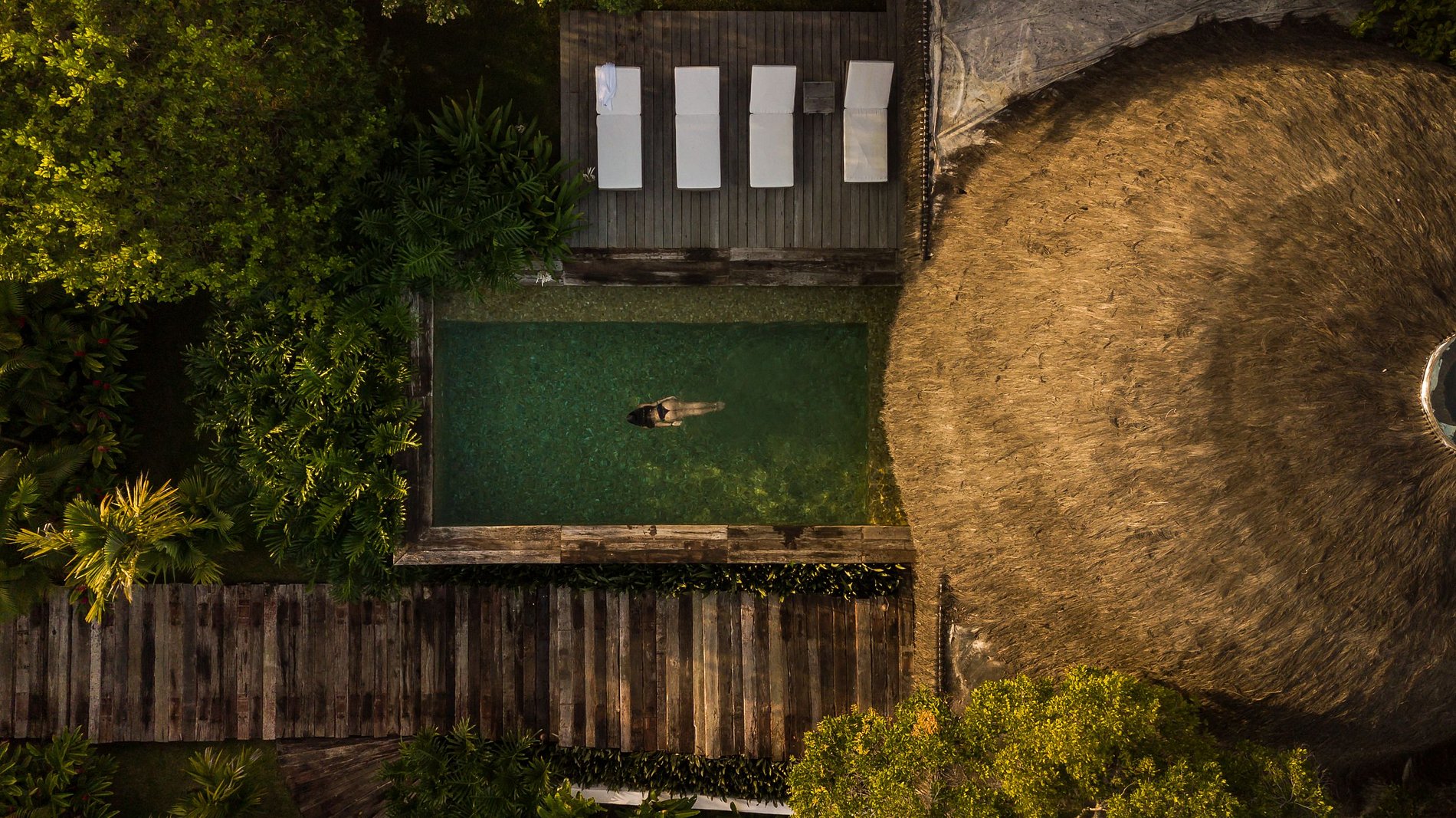 Autour de la cuisine, trois suites élégantes : deux avec lits king size et une avec trois lits simples. Toutes sont équipées de climatisation et décorées avec goût. L’espace piscine, avec ses transats, invite à profiter pleinement de l’extérieur, en toute intimité.