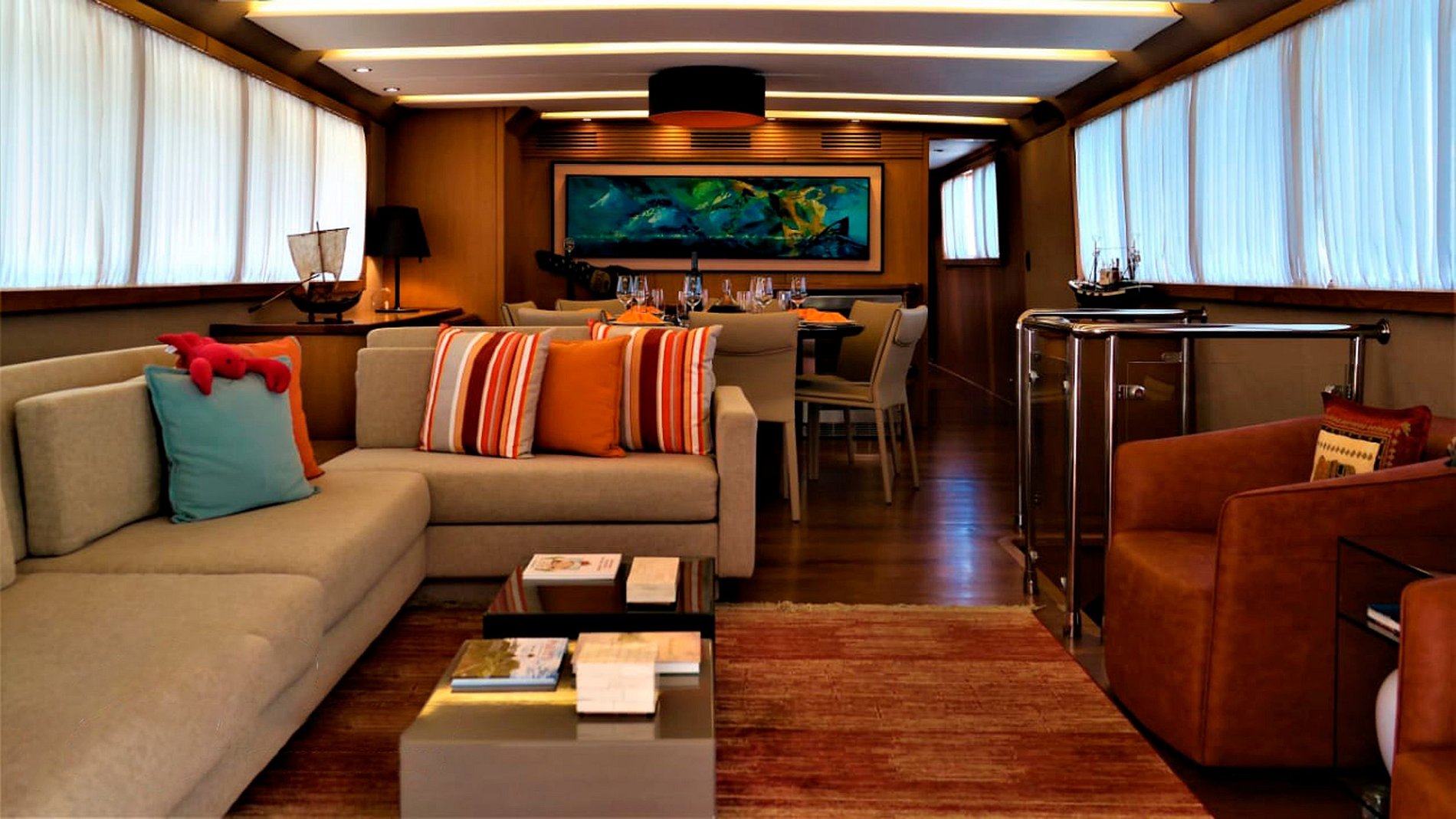 Ce bateau dispose de 5 cabines, 5 salles de bain, un salon, une salle TV, une salle à manger entièrement équipée, une buanderie, un jacuzzi, une baignoire, un barbecue, un bar, et bien plus encore.